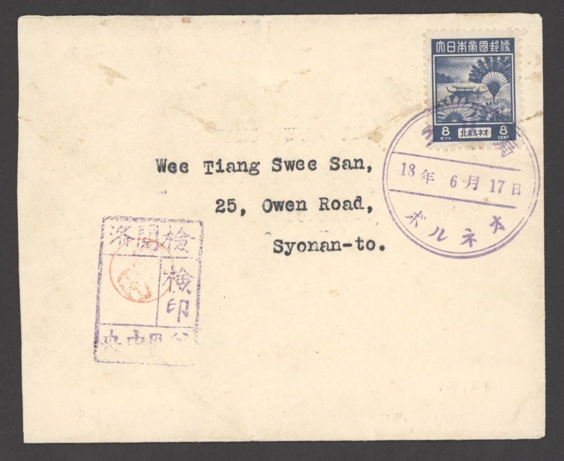1942 (18 June) envelope from Miri to Singapore, bearing North Borneo Pictorial 8c. tied by Japanese Type JD2 c.d.s. in violet and showing censor chop in opposite corner; the envelope slightly truncated at left