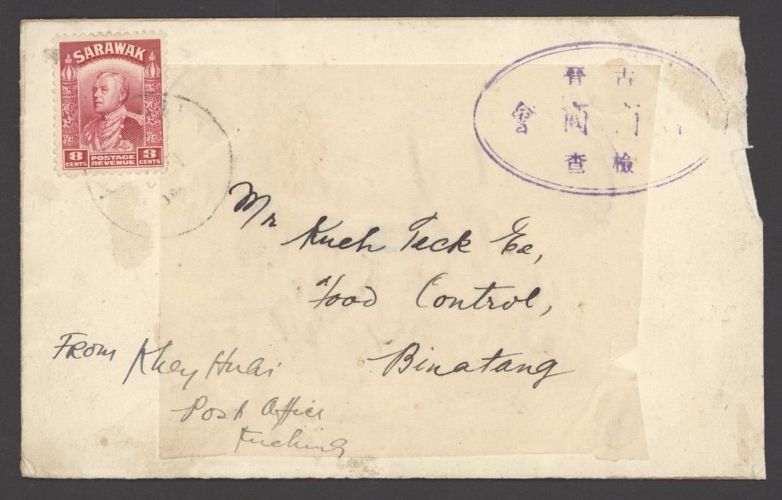 1942 re-used envelope from Kuching to Binatang, bearing unoverprinted 8c. tied by light