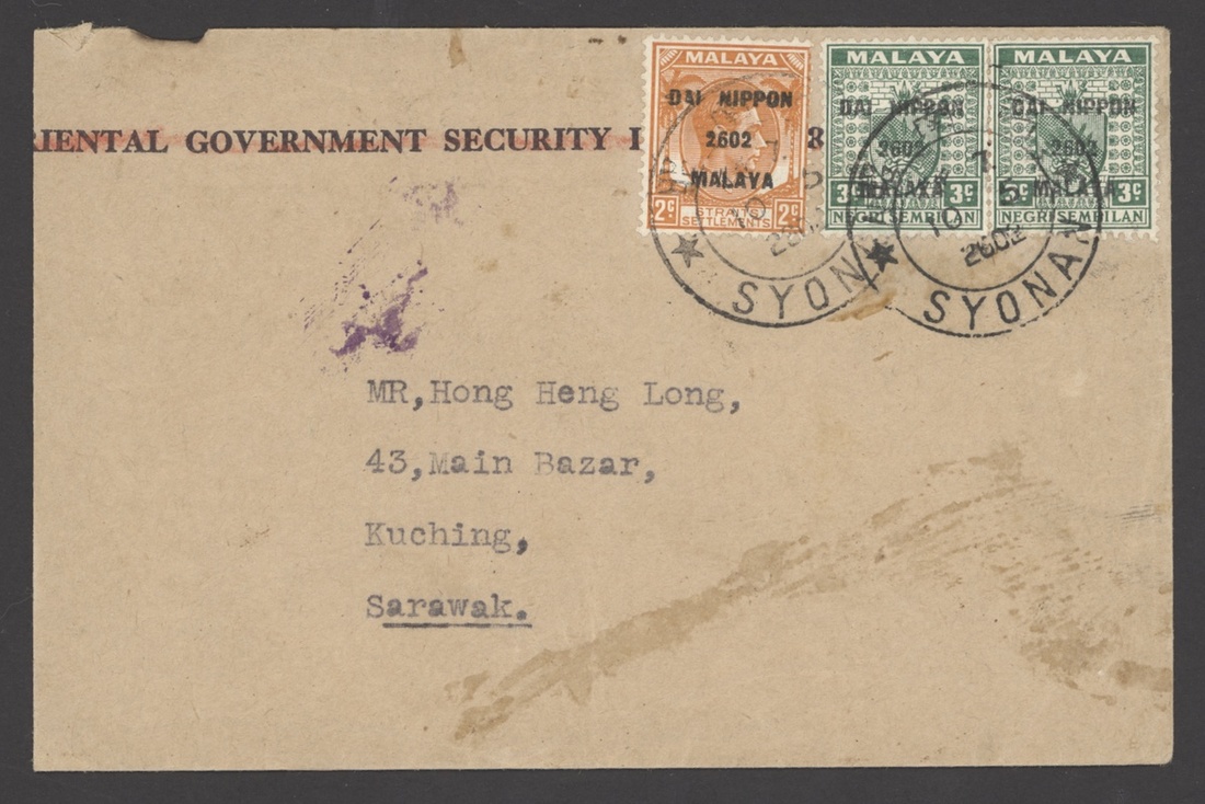 1942 (5 Oct.) envelope (a little truncated at left) from Singapore to Kuching, bearing Dai Nippon Straits Settlements 2c. and Negri Sembilan 3c. (2), all clearly tied by Japanese c.d.s. and showing violet censor chop on reverse