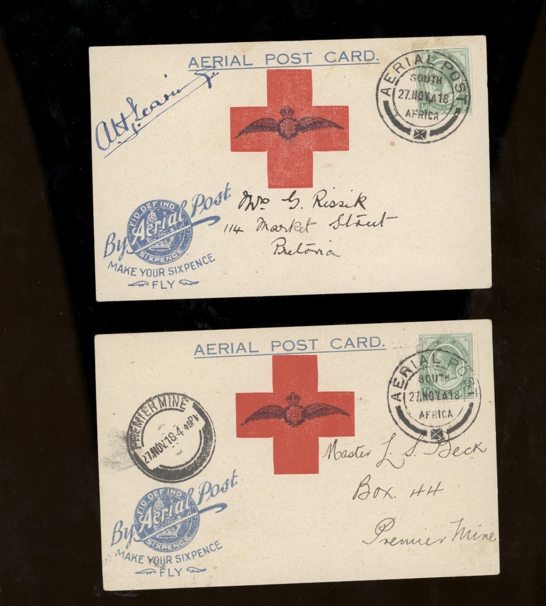 Pale blue first printing cards (2) both bearing ½d., one Pretoria and signed by Lt. A.H. Gearing, the other to Premier Mine without message and showing arrival datestamp (27.11) at left