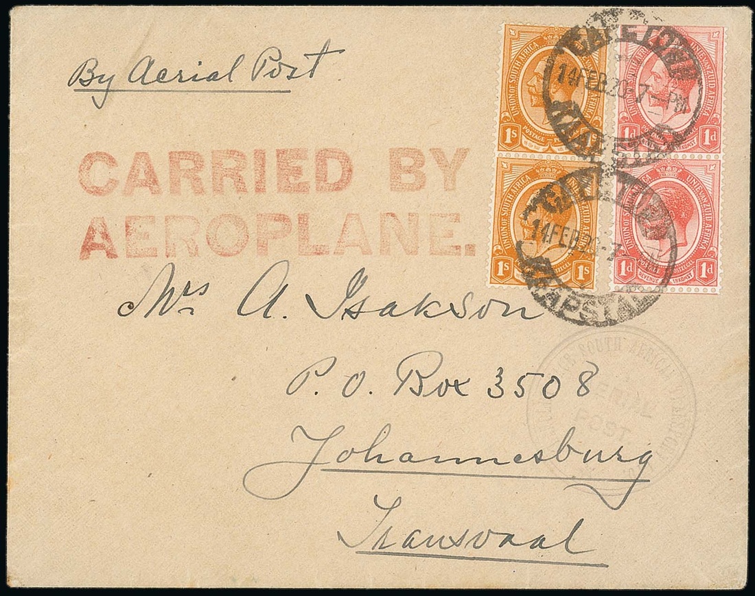 1920 (14 Feb.) envelope to Johannesburg, marked "By Aerial Post" and bearing 1d.. and 1/- pair with fine "
