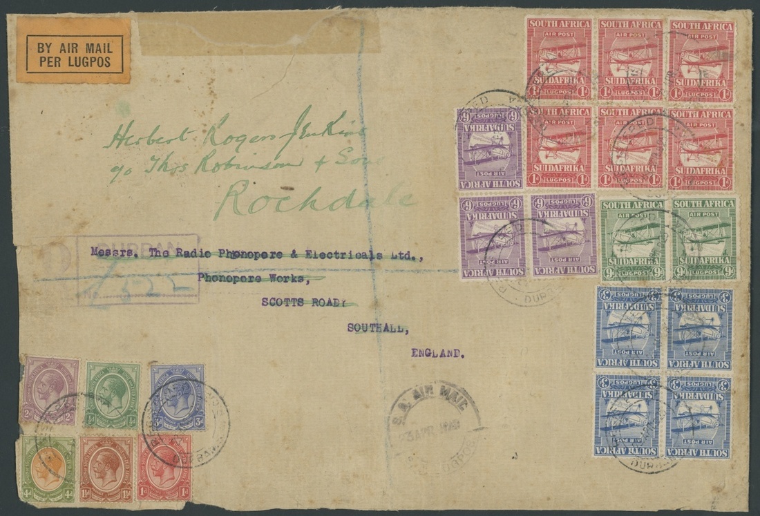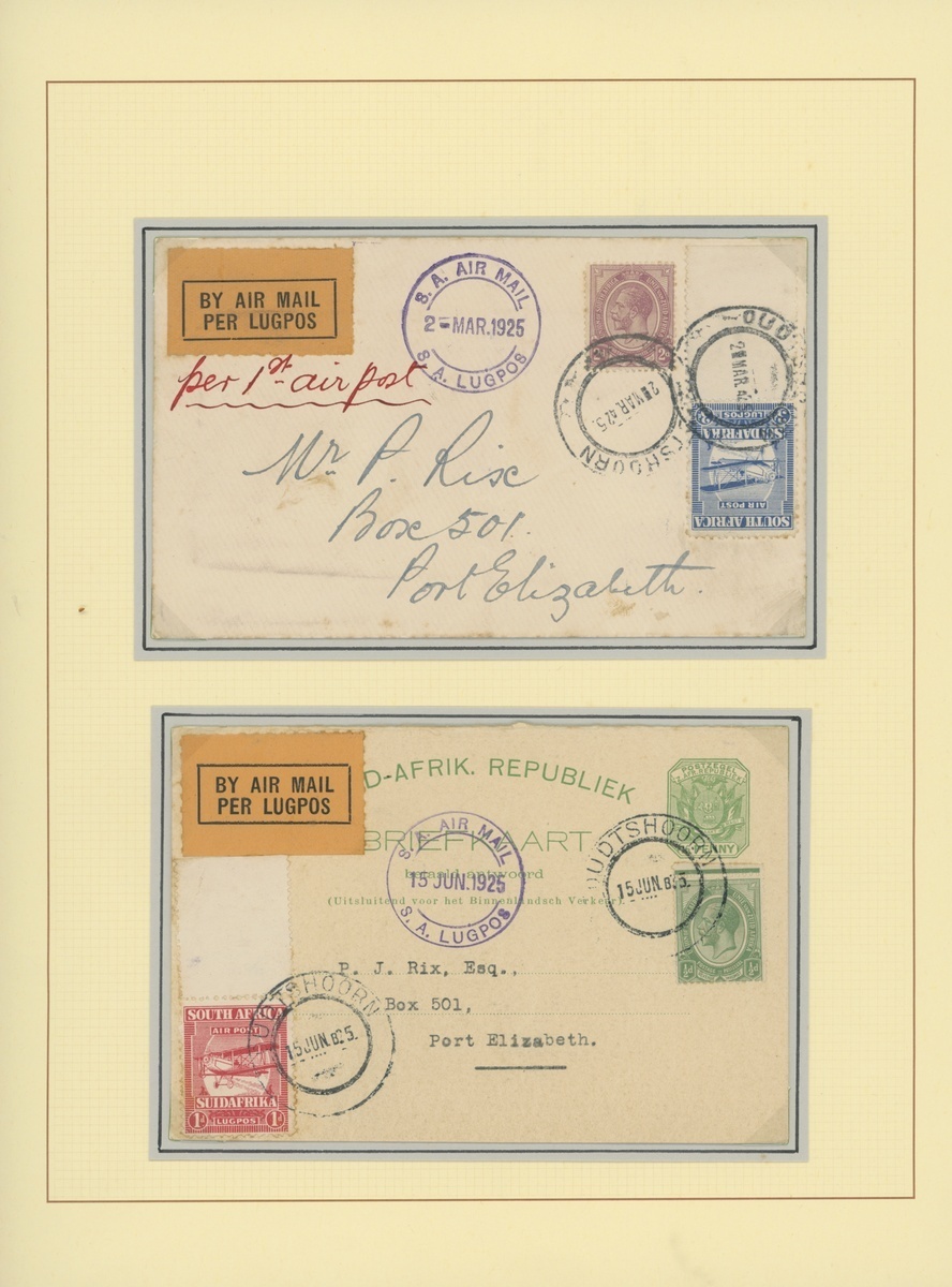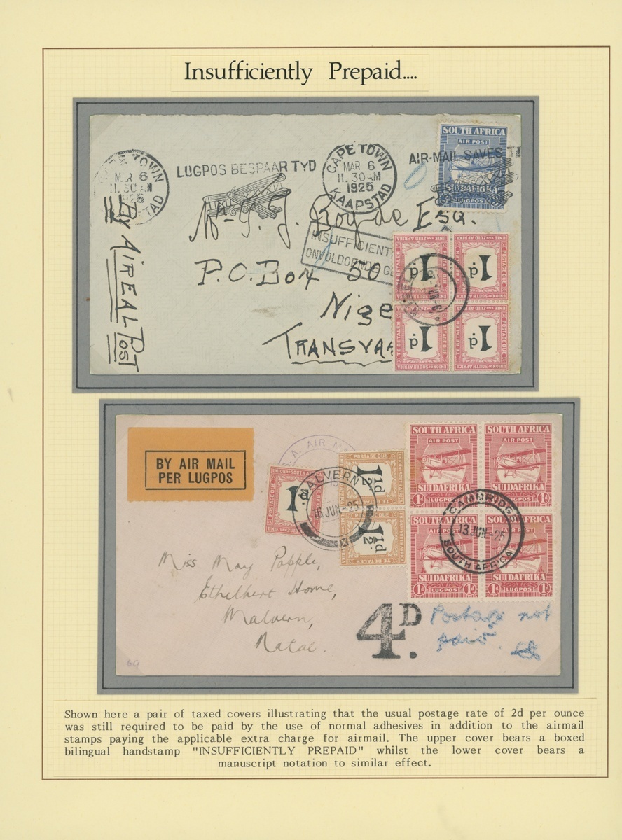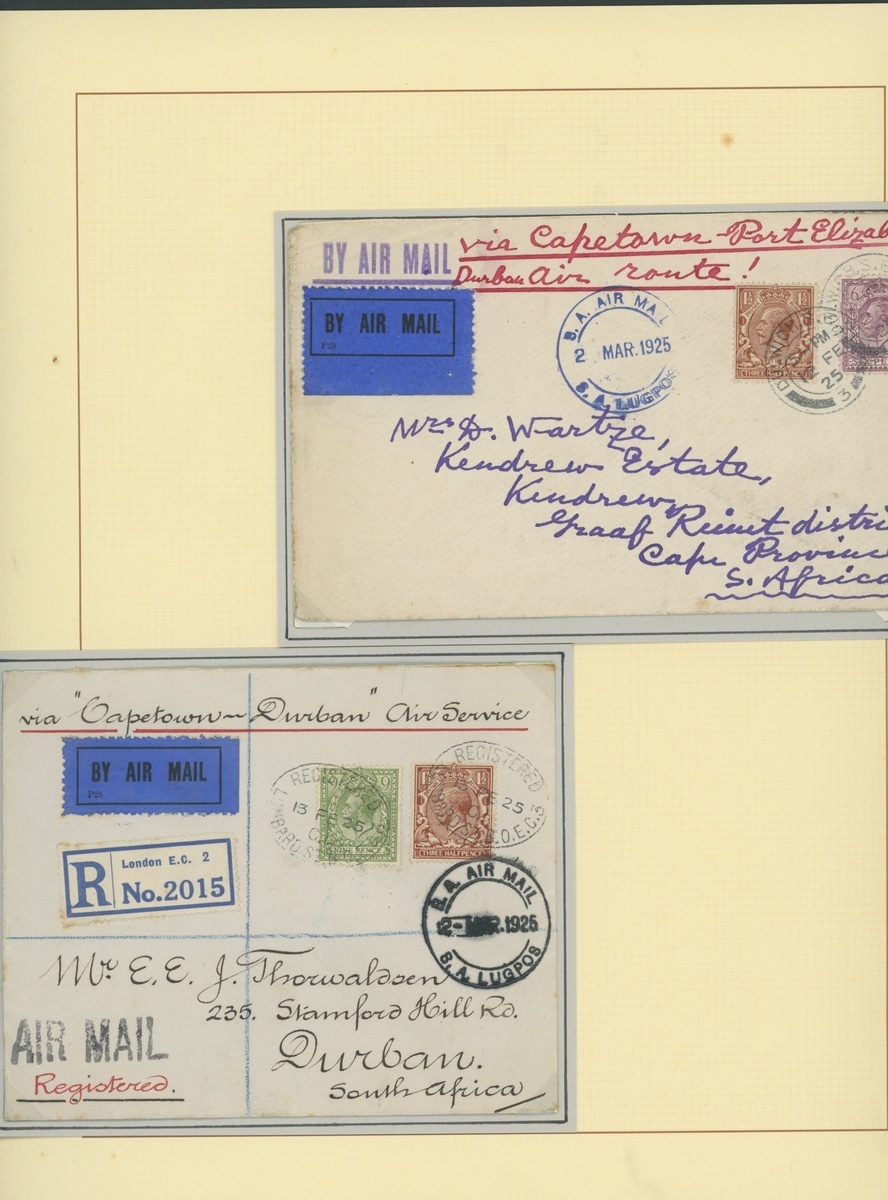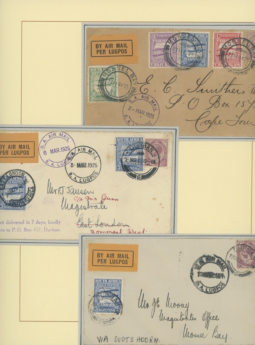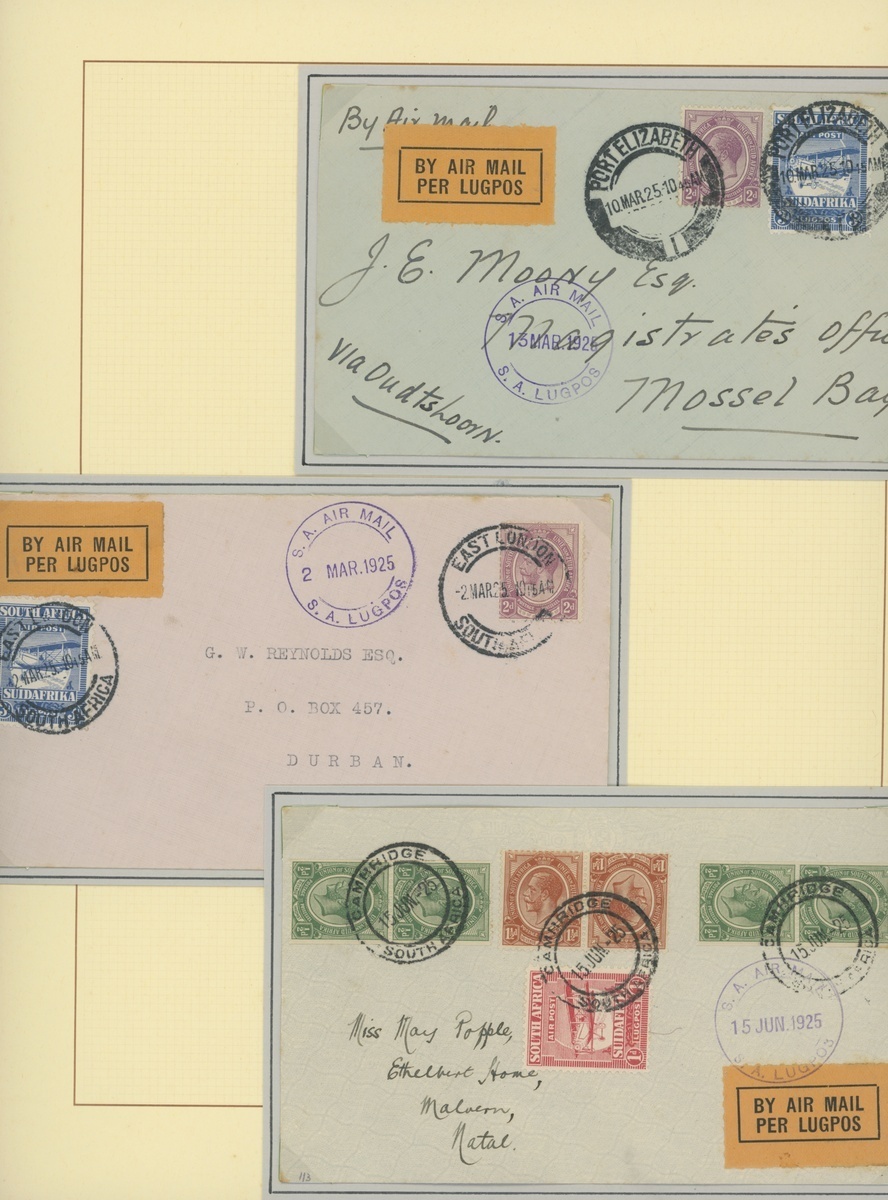 1925 (26 Feb.-15 June) range of covers (18) from Cape Town (5, one a large commercial envelope registered with 1d. (6), 3d. (4), 6d. (3), 9d. (2) and Postage of 1/-), Mossell Bay with a set, Oudtshoorn (2), Cambridge (2), Port Elizabeth with a set, East London and Durban (4), variously cancelled with two from Durban on 2 April showing the last use of the distorted rubber datestamp at 9.45am and first use of the new steel datestamp at 12 noon, most addressed internally, two with Postage Dues as the usual postage rate remained unpaid, and two to England; also Supplement to Circular No. 346 advertising the rates and flight times, and 1925 (Mar.) envelopes (2, one registered) from England sent to tie in with the service. A fine lot