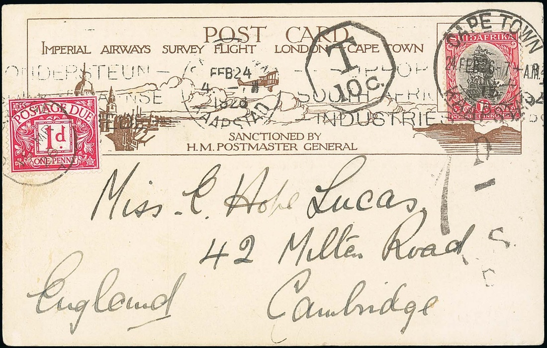 Card to Cambridge and carried on the round trip with perforated vignette in vermilion on reverse, bearing Ship 1d. tied by Cape Town 24 February 1926 machine and circular datestamps, showing hexagonal-framed "