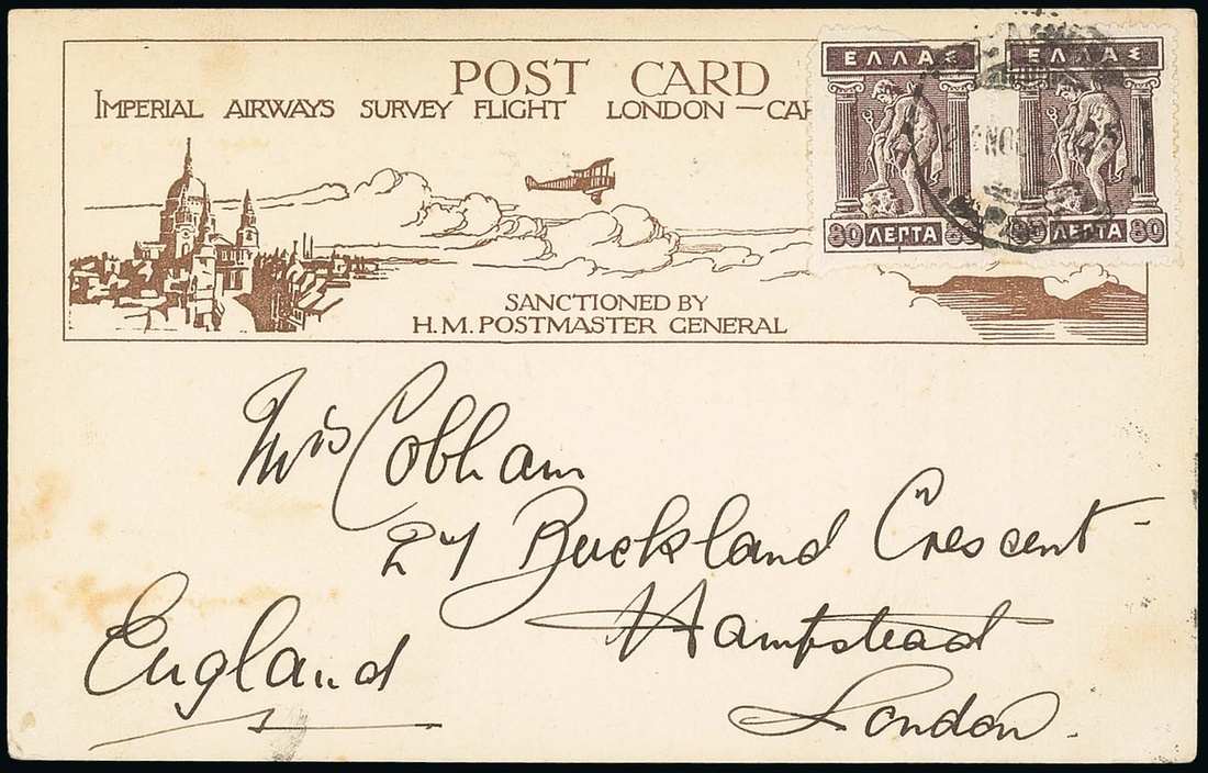 1925 (24 Nov.) card from Athens to his wife in Hampstead, bearing 80d. pair sharing datestamp, the reverse with perforated vignette in vermilion and with message including "Isn't it rough luck, this infernal delay"