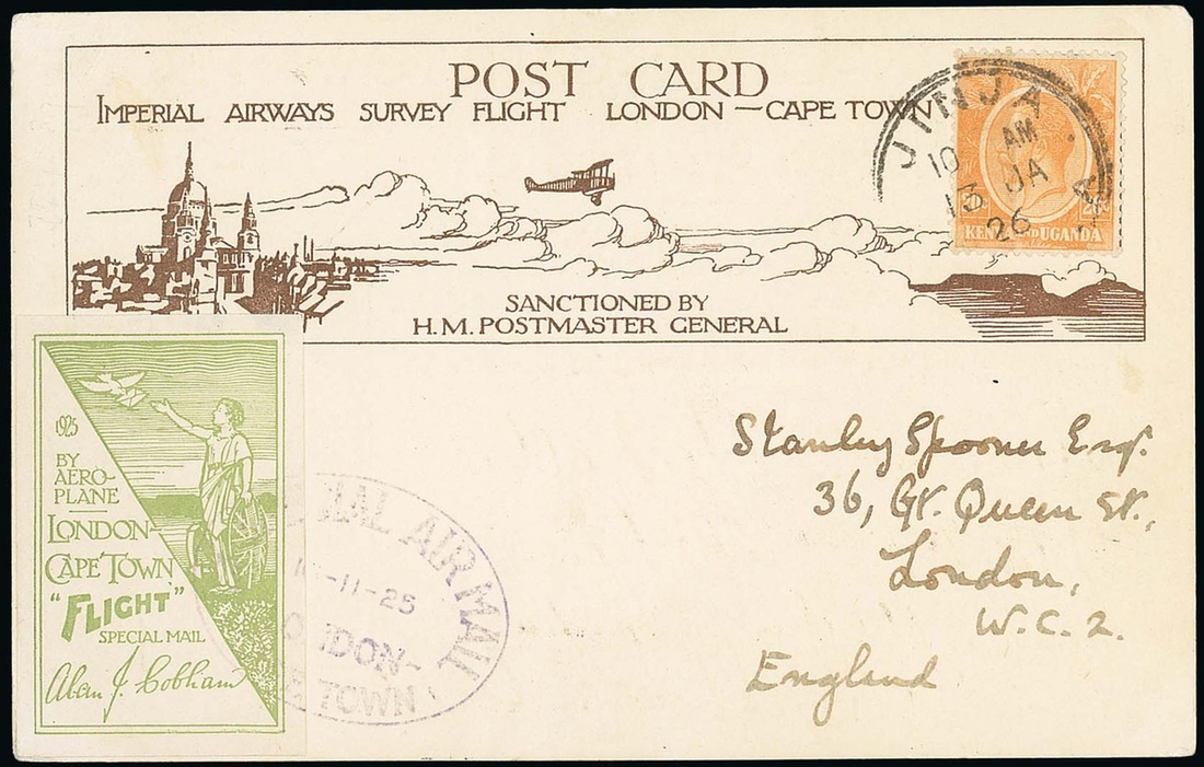 1926 (13 Jan.) card from Jinja to Stanley Spooner, Editor of "Flight" in London, bearing 20c. with datestamp and imperforate vignette in green cancelled by "