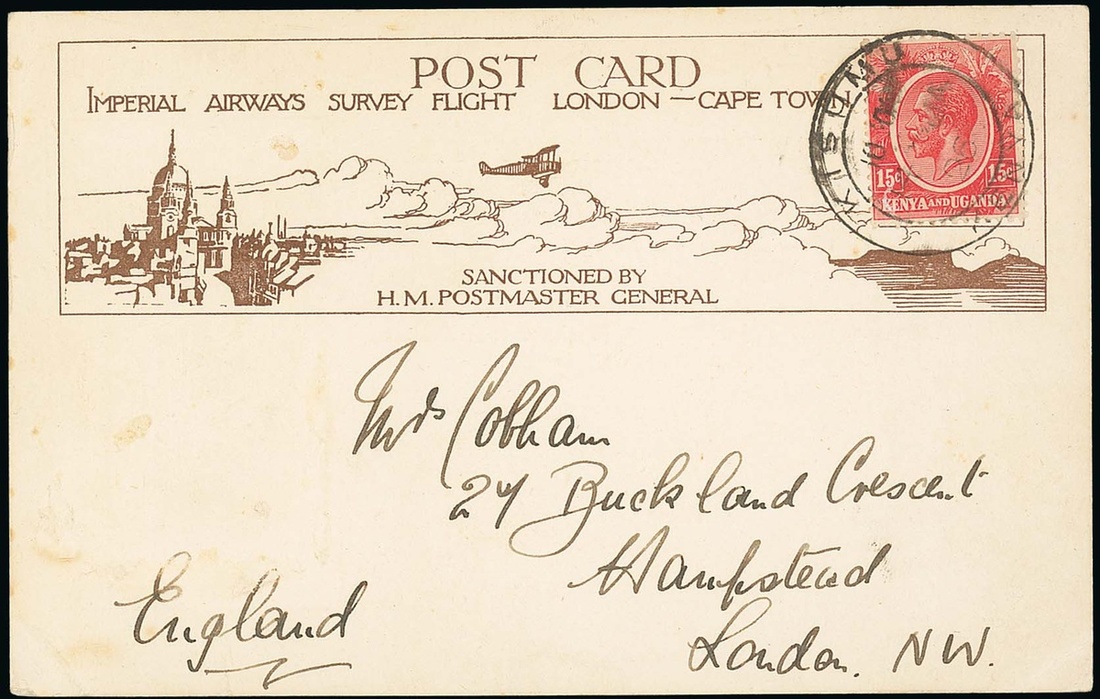 1926 (14 Jan.) card from Kisumu to his wife in Hampstead, bearing 15c. with datestamp and with traces of a vignette having been removed at left, the reverse with a perforated vignette in vermilion (surface abrasions) and with message including "We have now crossed the equator and landed about 10 miles to the south at Kisumu. All is going we..."