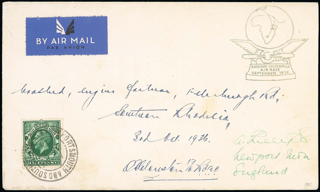 Envelope from Portsmouth to Newport bearing ½d. and showing illustrated flight cachet, marked "Crashed, engine failure, Felixburg Rd., Southern Rhodesia 3rd. Oct, 1936 A E Clouston". Nierinck 360930D