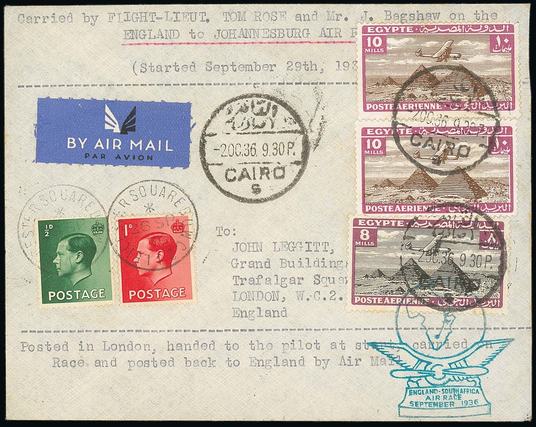 Envelope to England with typed details of the flight, bearing ½d. and 1d. cancelled by Leicester Square datestamps, upon arrival and withdrawal mailed back to the U.K. with Egypt 8m. and 10m. (2) with Cairo datestamps (2.10) and with the 8m. additionally tied by flight cachet in green, signed by both pilots on reverse and one of very few covers mailed back to the U.K. after the withdrawal. Nierinck 360930A