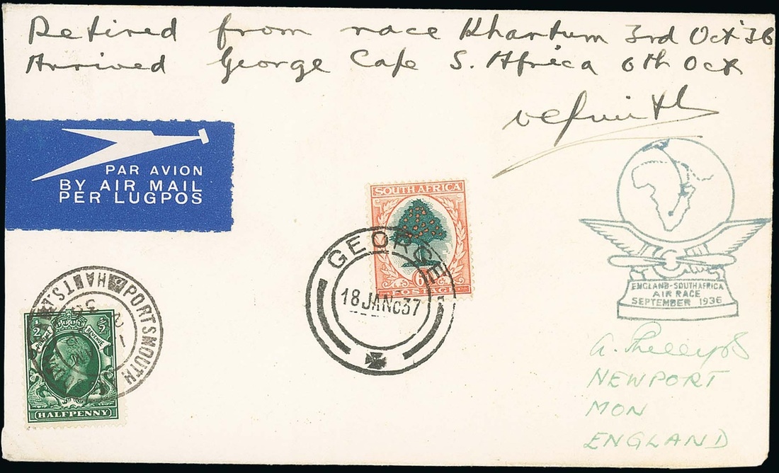 Envelope to England bearing G.B. ½d. with Portsmouth and Southsea datestamp and South Africa 6d. with George datestamp (18.1), marked "Retired from race Khartoum 3rd Oct. 36. Arrived George Cape South Africa 6 Oct.", autographed "V Smith" and with flight cachet below; accompanied by a contemporary photograph of Smith standing by his Miles Sparrow aircraft and signed "To Mr. Wyndham with Kind Regards V Smith". Nierinck 360929C