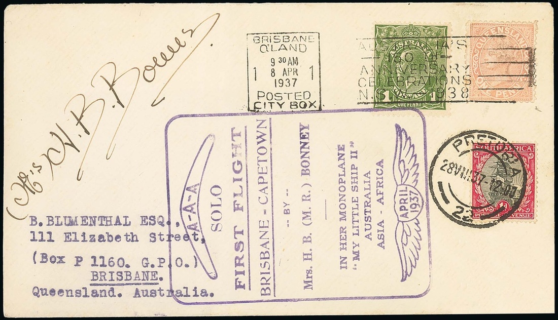 1937 (9 Apr.) envelope bearing Queensland 1d. and Australia 1d. sharing Brisbane machine datestamp, showing large flight cachet in violet on front and reverse and bearing South Africa 1d. with Pretoria datestamp (28 Aug.), autographed "Mrs. H.B. Bonney" at upper left. Nierinck 370420