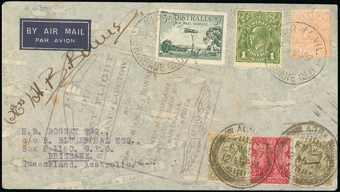 1937 (9 Apr.) envelope bearing Queensland 1d., Australia 1d. and Air 3d. with Brisbane datestamps, showing large flight cachet in violet on front and reverse and bearing India 3a. and 4a. (2) with Agra datestamps (8.5).), autographed "Mrs. H.B. Bonney" at upper left. Nierinck 370420