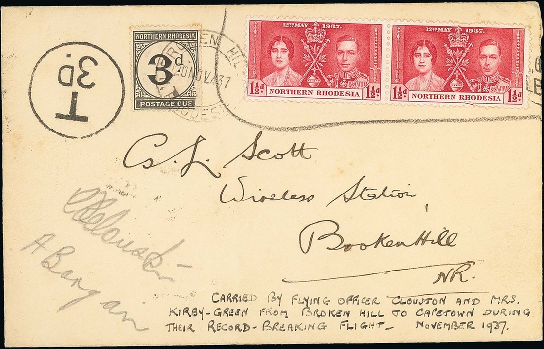 1937 (14 Nov.) Southbound trip envelope from the pilots brief touchdown at Broken Hill, Northern Rhodesia, addressed locally to G.L. Scott, the local wireless operator, bearing Coronation 1½d. to prepay the postage for the return from Cape Town, the pair circled in pencil as being unacceptable for the return postage and charged 3d. Postage Due with Broken Hill datestamp (10.11) and circular-framed "