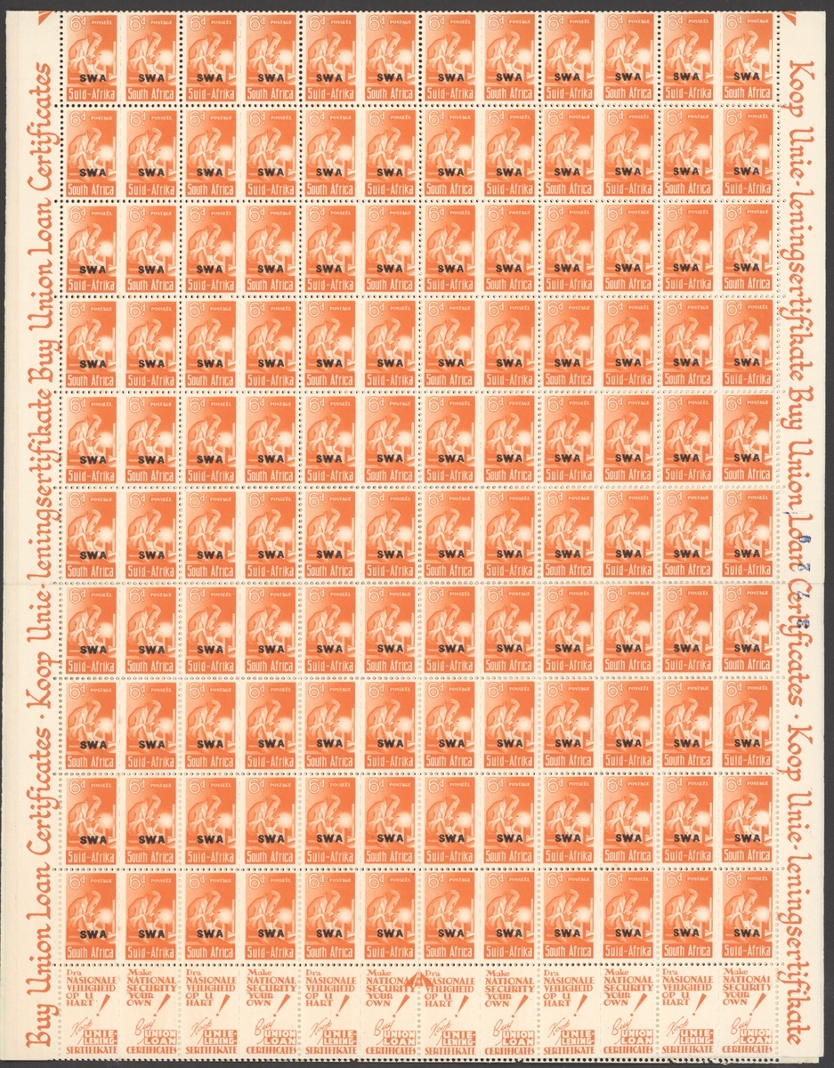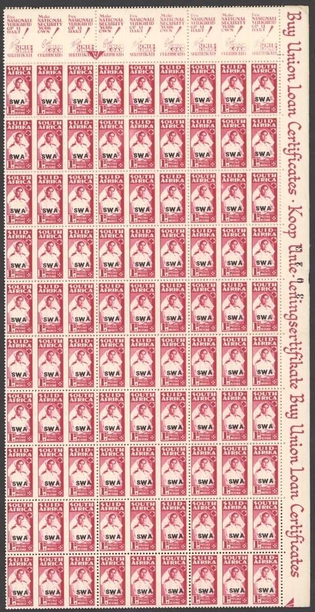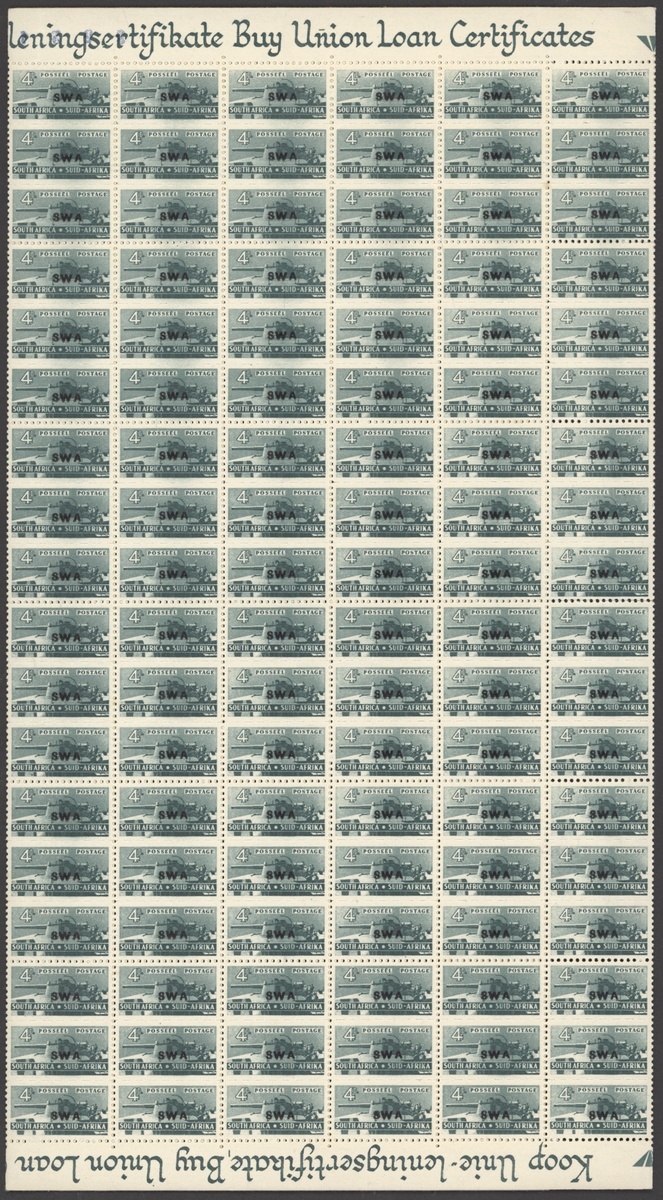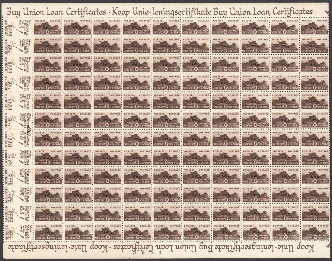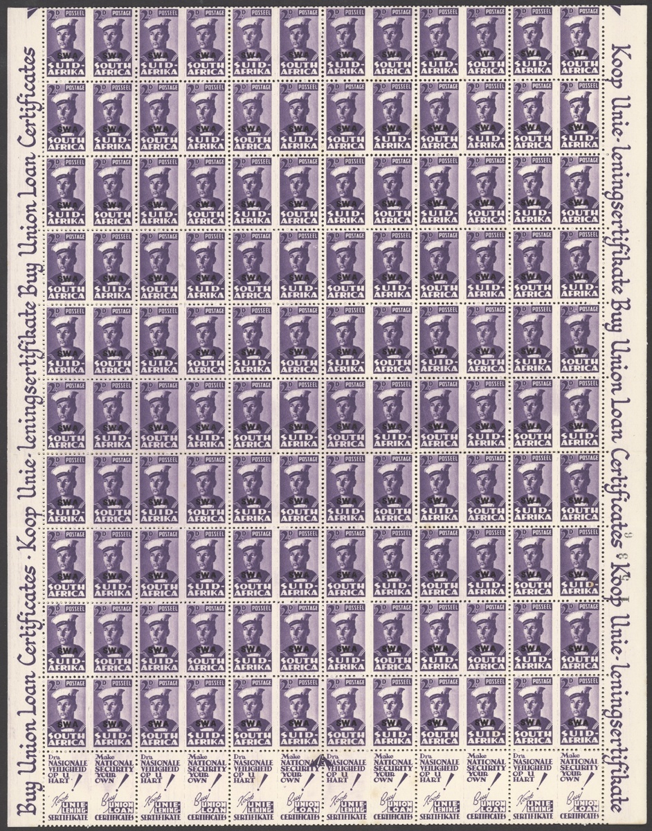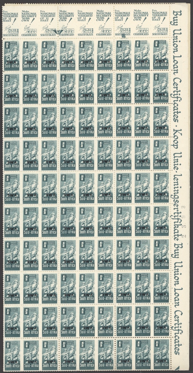 1942-43 War Effort ½d. to 1/- set of eight, the 1/- from the 1944 printing, all in panes of 120, unmounted mint; odd slight stain, folds splitting some perfs, chiefly fine. S.G. 123-130. Also 1945 Victory block of four proofs of the overprint on wove paper, fine