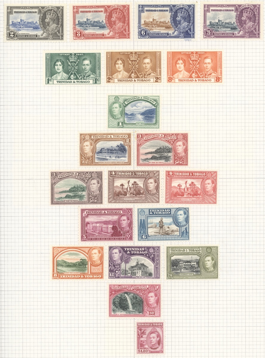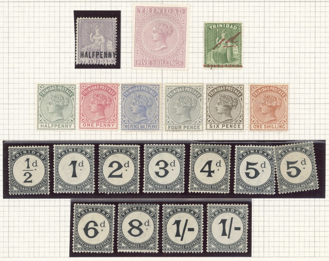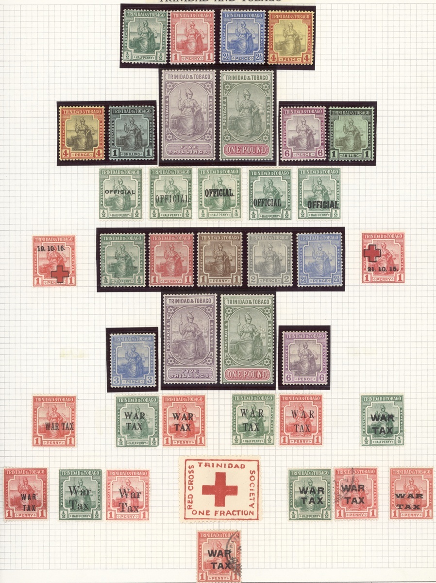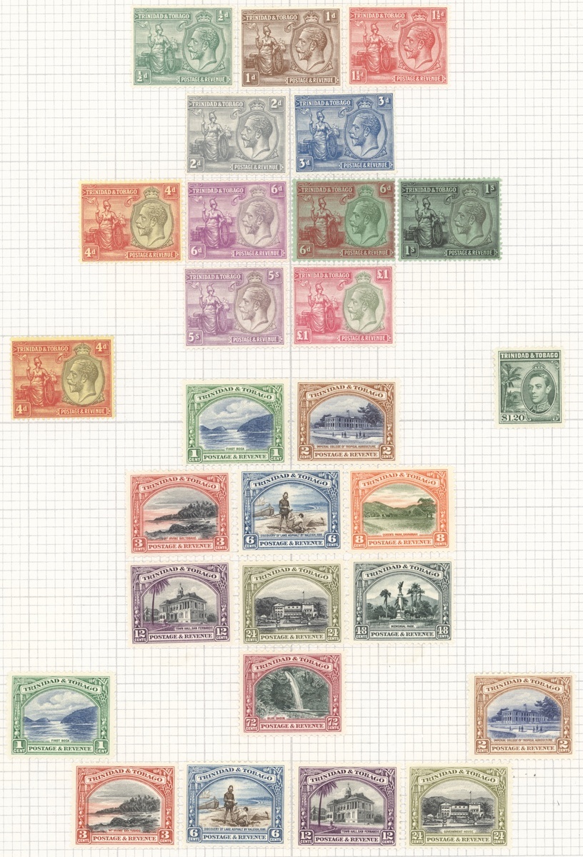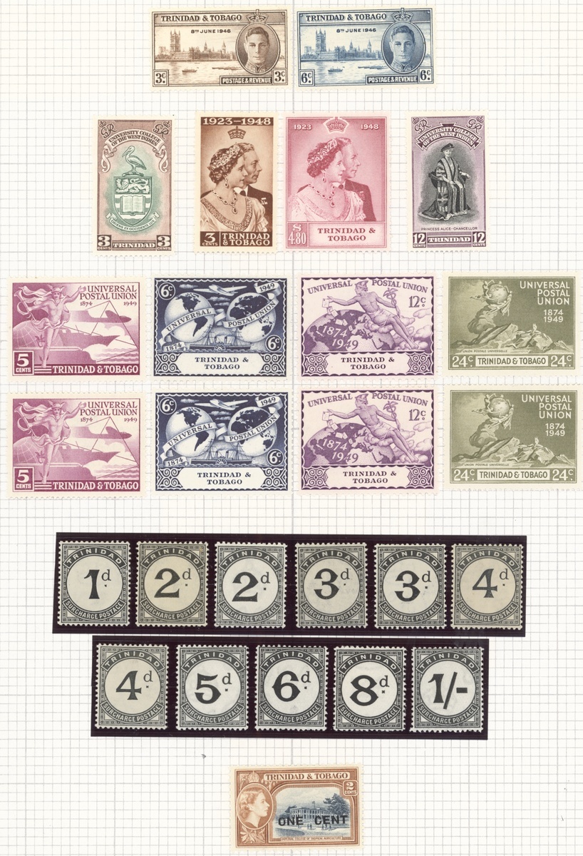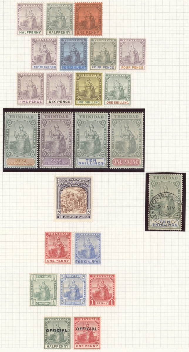 A mint collection including 1883-94 ½d. to 5/-, 1896-1906 5/-, 10/- and £1, 1901-06 ½d. to 5/-, 1904-06 5/- and £1, Trinidad and Tobago 1913-23 ½d. to £1, 1921-22 ½d. to £1, 1922-28 ½d. to £1, 1935-37 1c. to 72c., 1938-44 1c. to $4.80 and Postage Due 1885 ½d. to 1/-, 1905-06 1d. to 1/- (some a little toned) and 1923-45 1d. to 1/- (some a little toned), fine. Cat. £2400+