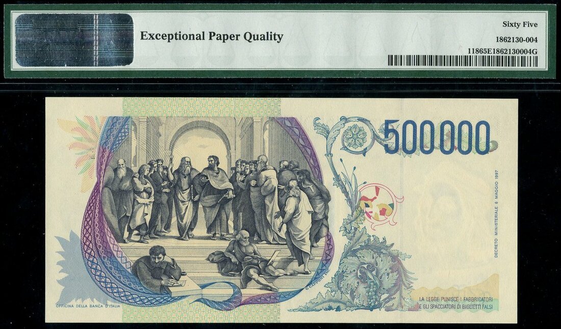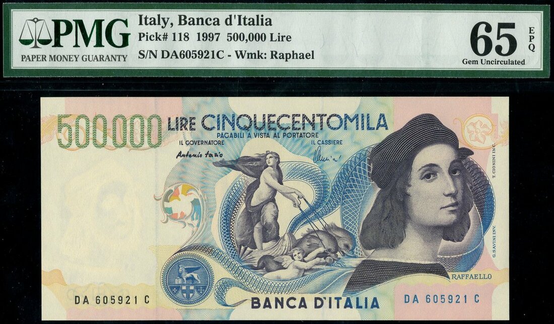 (x) Banco d'Italia, 500,000 lire, 1997, serial number DA605921C, blue and multicoloured, Raphael at right, maiden on sea chariot at centre, 'the Triumph of Galatee', signatures of Fazio and Amici