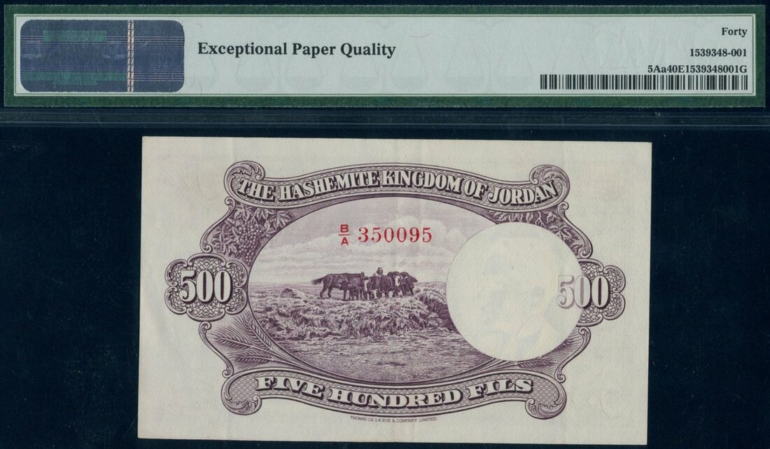(x) The Hashemite Kingdom of Jordan, Currency Board second issue, 500 Fils, Law of 1949 (1952), red serial number B/A 531871, lilac and pale green, landscape with irrigation system, signatures of Anestas Haqnaneyah and Baha Al-Din Toukan, reverse, lilac, cattle
