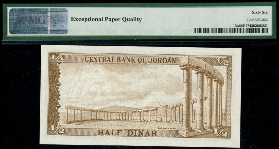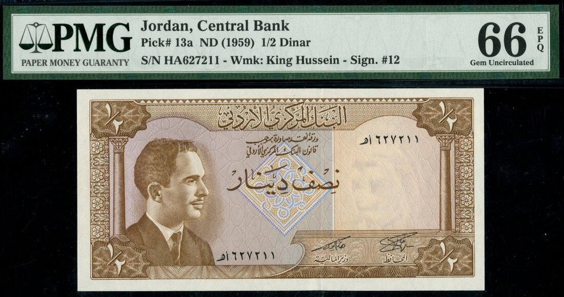 (x) Central Bank of Jordan, 1/2 dinar, law of 1959, serial number HA 627211, brown, pale blue and orange, King Hussein at left, Al Jayoosi and Al Salem signatures