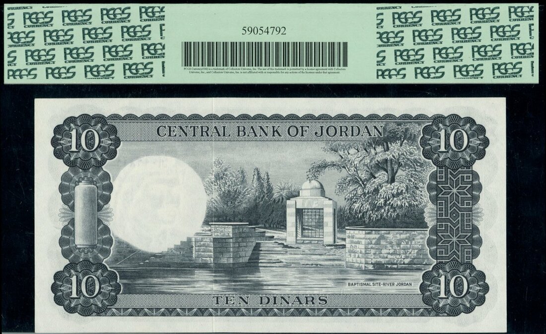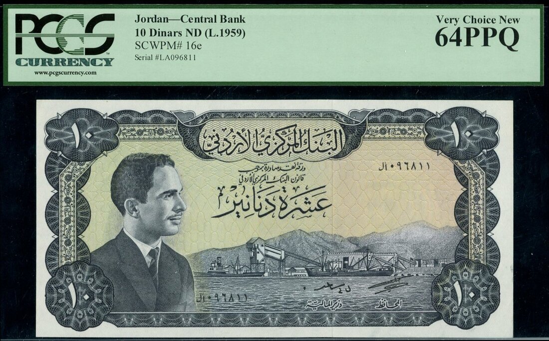 (x) Central Bank of Jordan, 10 Dinars, 1959 (1965), serial number LA 096811, black and multicoloured, King Hussein at left