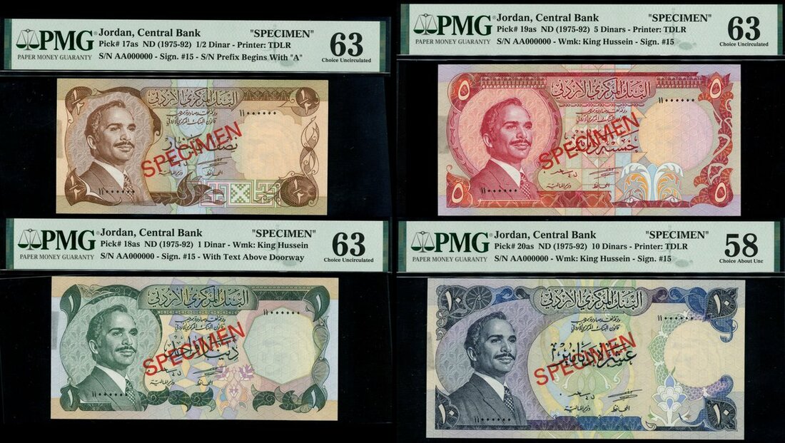 Central Bank of Jordan, a partial set of specimens from the 1975-88 'Second Series', including 1/2 dinar, brown, signature Massadeh and Al Nabulsi, 1/2 dinar, brown, reverse, columns at Jerash, 1 dinar, green, signature Massadeh and Al Nabulsi, reverse, Dome of the Rock, 5 dinars, red, signature Massadeh and Al Nabulsi, reverse, Petra, 10 dinars, purple, signature Massadeh and Al Nabulsi, reverse, amphitheater in Amman, all ND (1975), all King Hussein at left