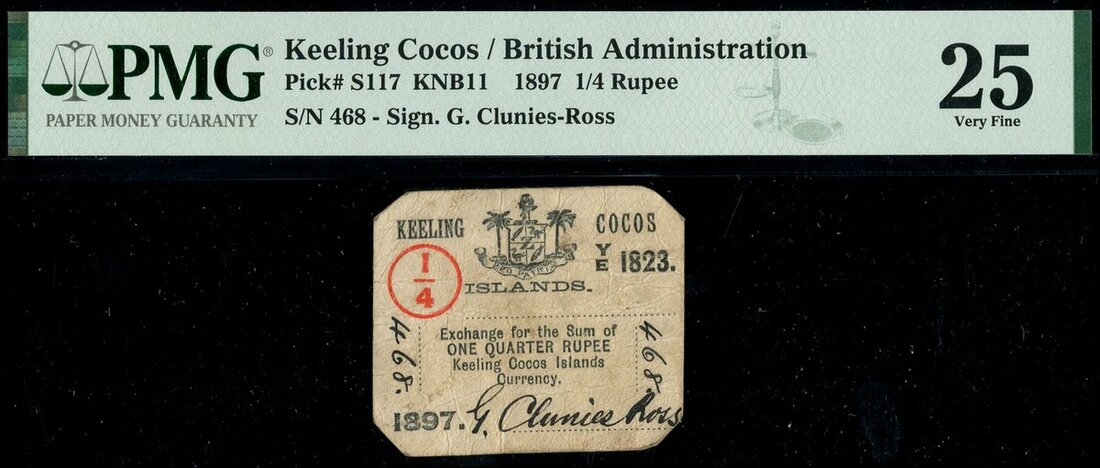 (x) Keeling Cocos Islands, 1/4 rupee, 1897, manuscript serial number 468, black text on cardlike paper, value in red circular frame top left, arms top centre, manuscript signature of George Clunies Ross low right