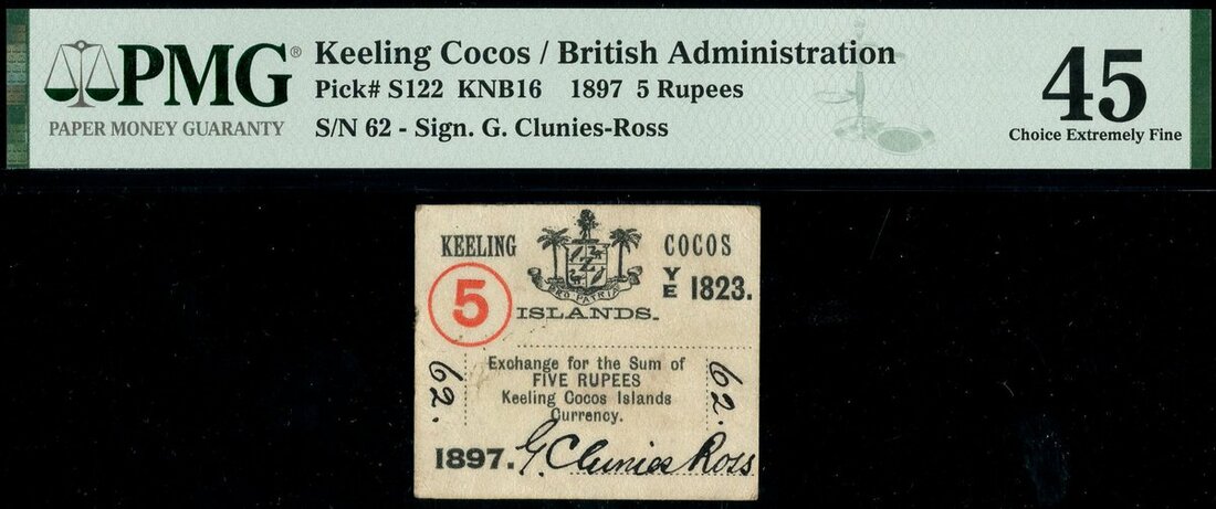 (x) Keeling Cocos Islands, 5 rupees, 1897, manuscript serial number 62, black text on card like paper, value in red circular frame top left, arms top centre, manuscript signature of George Clunies Ross low right