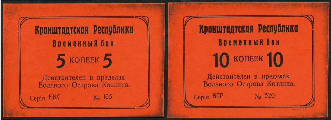 (x) Kronstadt Republic, 5 and 10 kopecks, ND (1917), black text on red paper