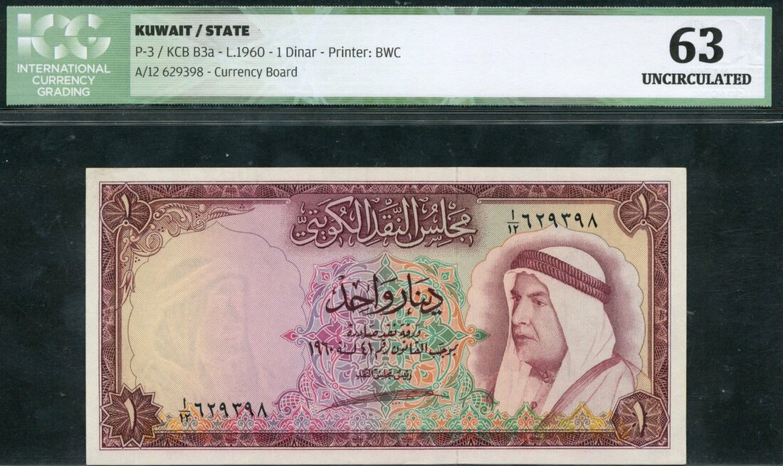 (x) Kuwait Currency Board, 1 dinar, L.1960, serial number A/12 629398, (Pick 3, TBB B103), in ICG holder 63 Uncirculated