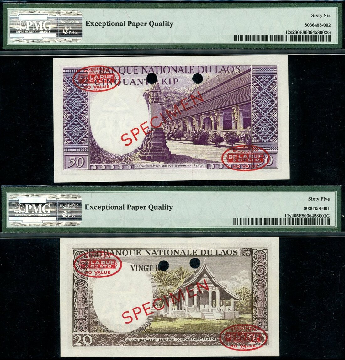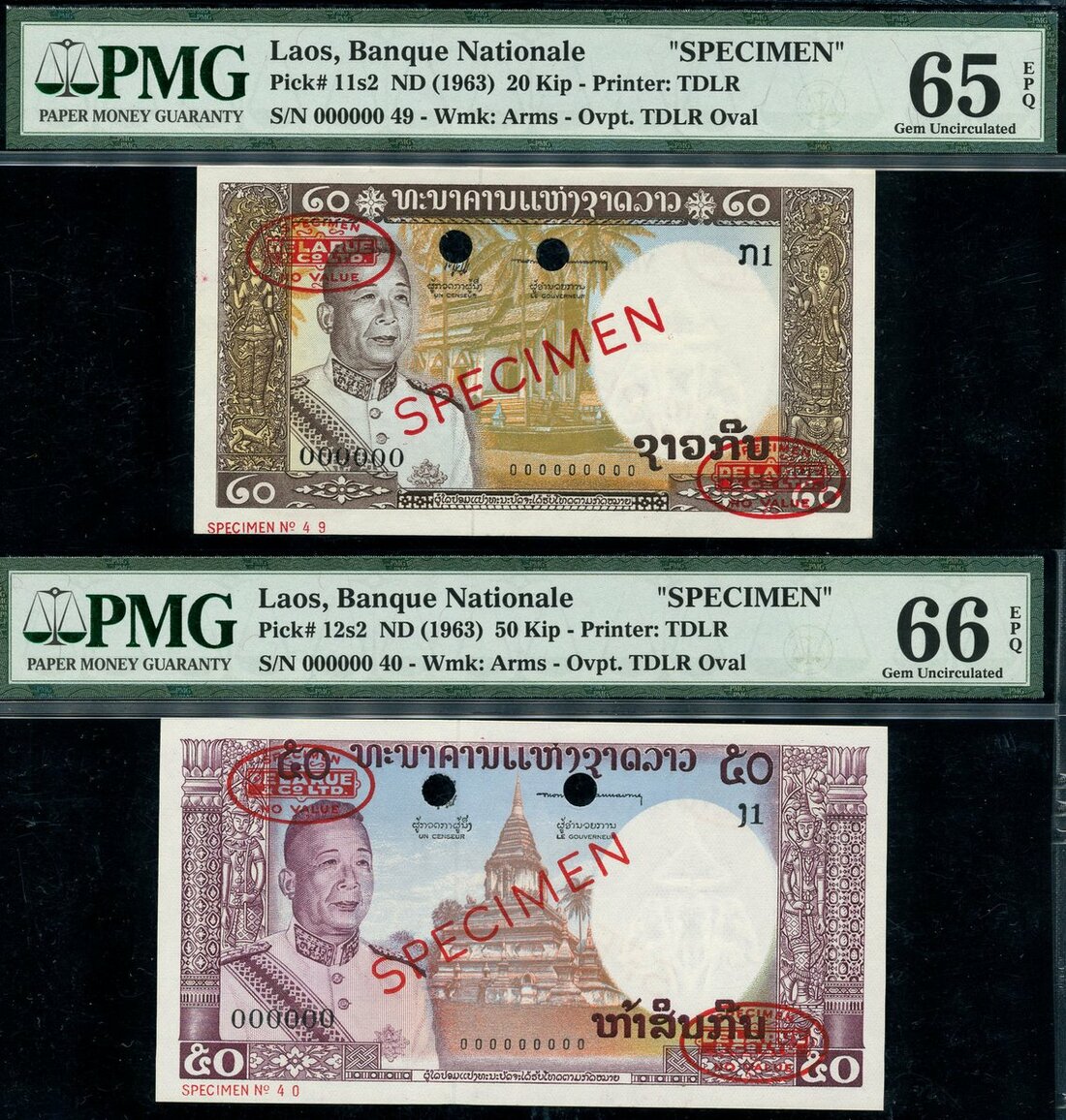 (x) Banque Nationale, Laos, specimen 20 and 50 kip, ND (1963), zero serial numbers (Pick 11s2, 12s2), red SPECIMEN overprint, in PMG holders 65EPQ and 66EPQ (2 notes)