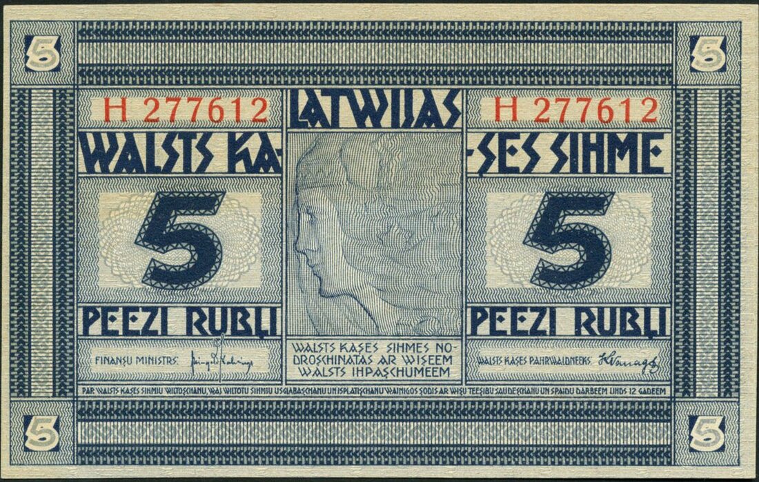 (x) Latvia, 5 rubley, 1919, serial number H 277612, (Pick 3f, TBB B103f), slightly pressed, otherwise about uncirculated