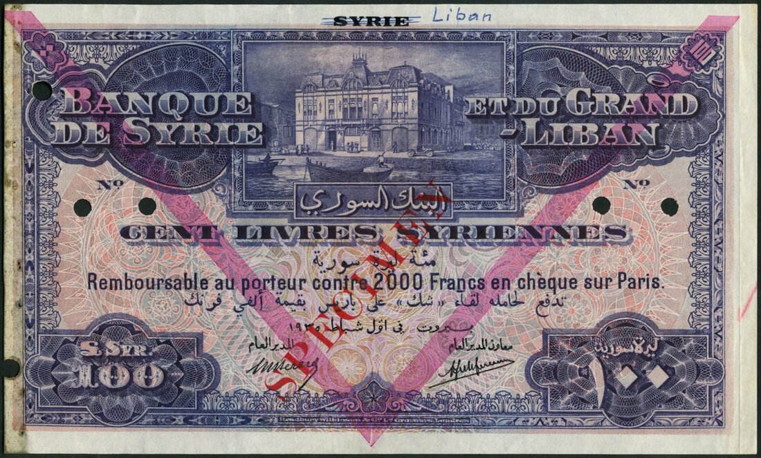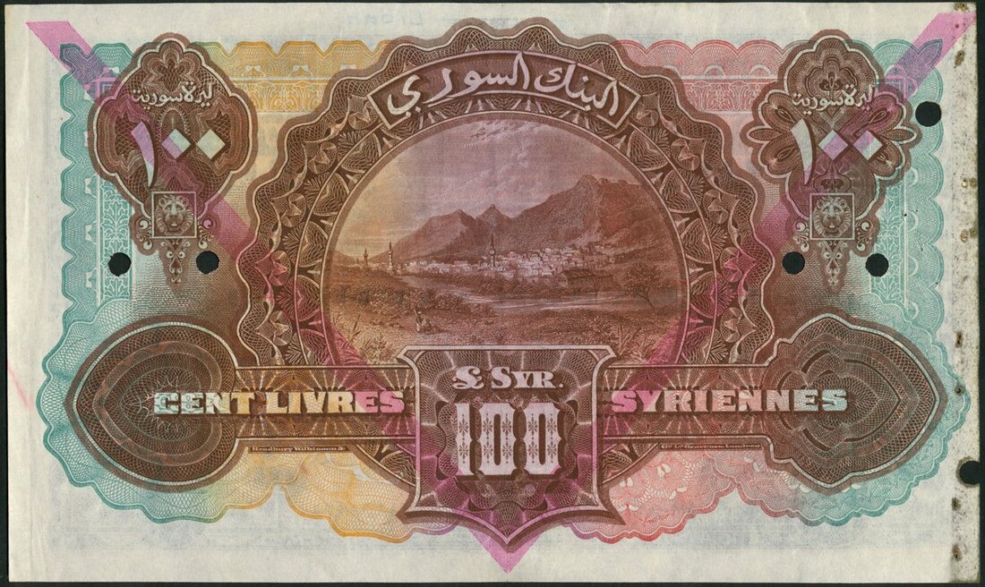 Banque de Syrie et du Grand-Liban, Syria, specimen 100 livres, 1935, without serial numbers, dark blue and pink, the Bank of Beirut office on the quayside, value at centre and at each corner, pink chevron overprint, signatures of Bearard and Laferriere low centre, SYRIE cross cancelled in top margin, reverse brown and multicoloured, a view of Antioch at centre, value in field, pink chevron overprint