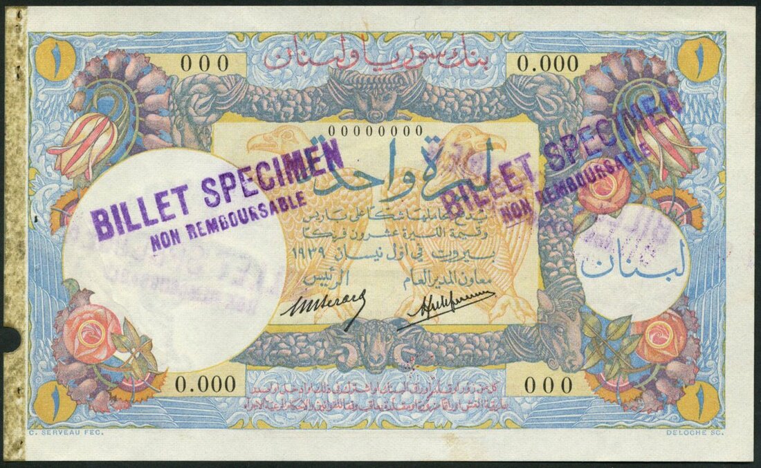 Banque de Syrie et du Liban, Lebanon, specimen 1 livre, 1 September 1939, zero serial numbers, light blue and multicolour, two eagles at centre, ornate scroll work around, value at each corner, Berard and Laferriere signatures, reverse, multicolour, red LIBAN top left, corn ears, flora and antelope heads at left and right, cedar tree and mountains in background