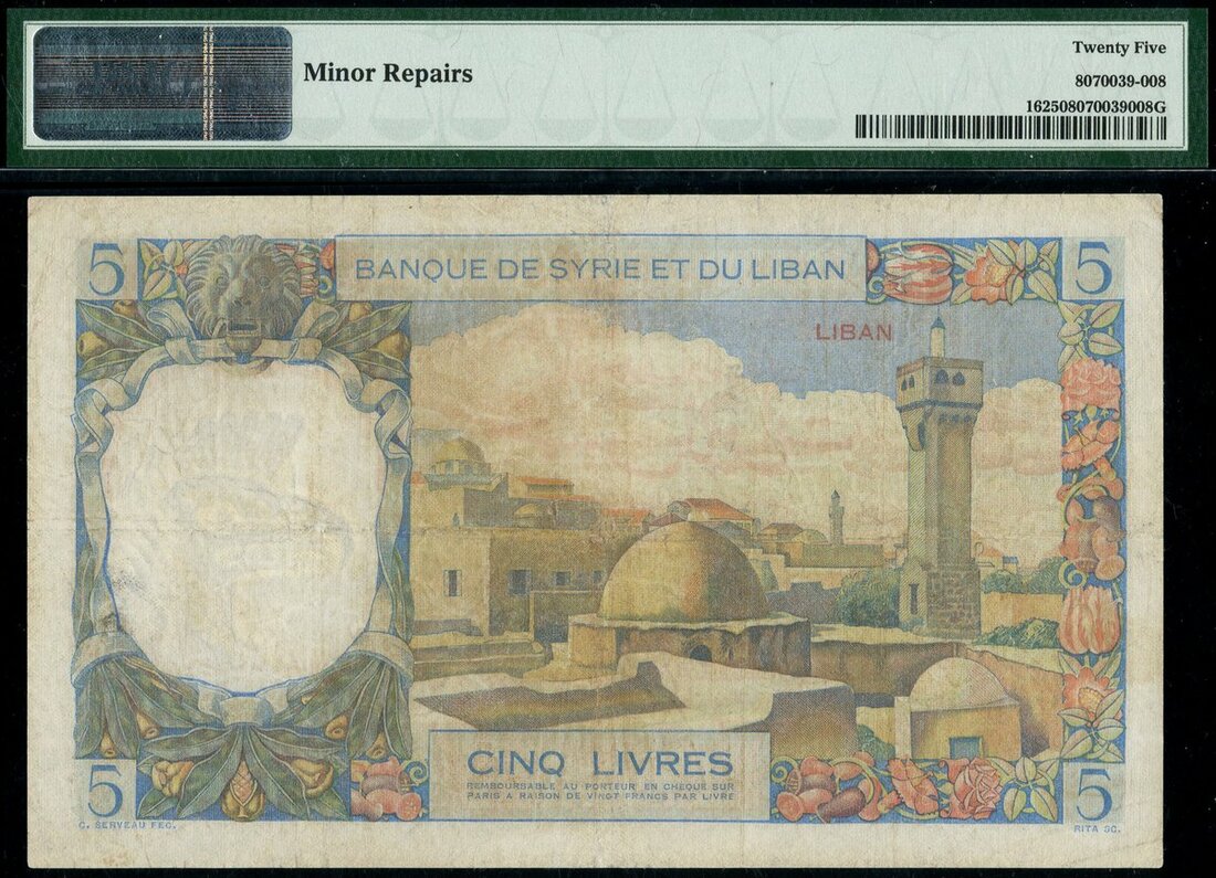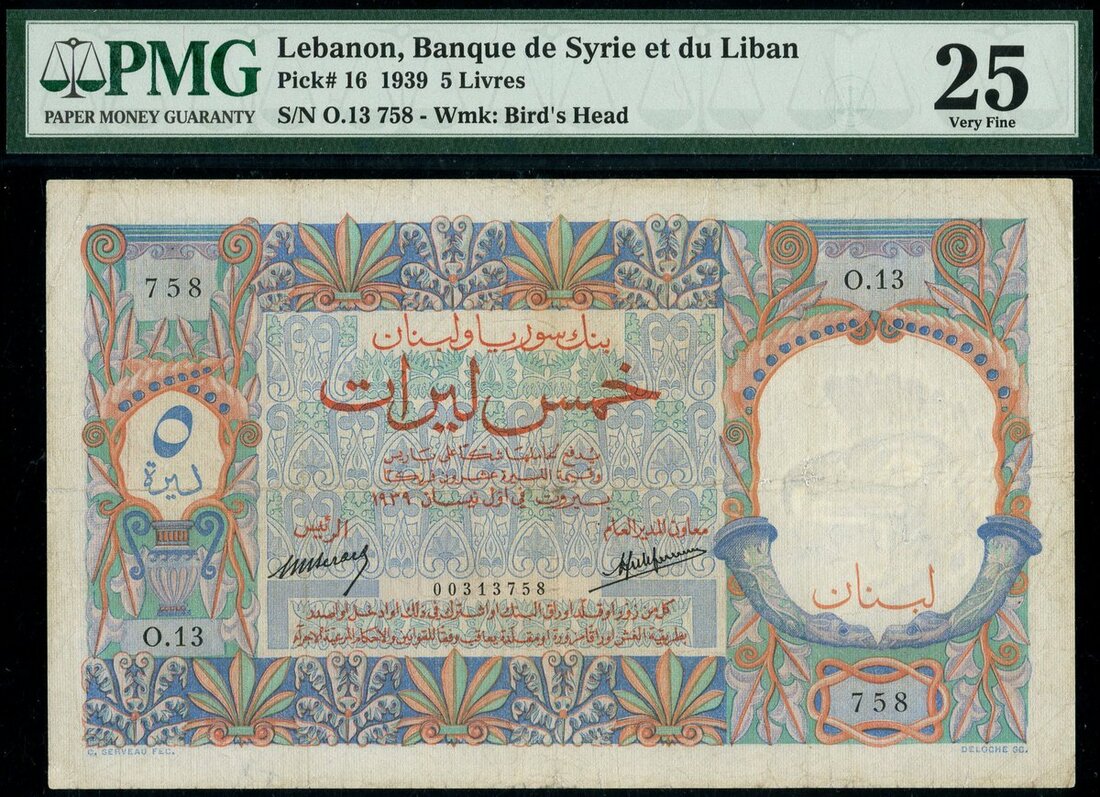 (x) Banque de Syrie et du Liban, Lebanon, 5 livres, 1939, serial number O.13-758, blue and multicolour, drinking horns at right, urn at left, beautifully ornate scroll work around, value at left, Berard and Laferriere signatures, reverse, light blue and multicoloured, view of Ras Beirut, value at each corner and low centre, LIBAN in red top right