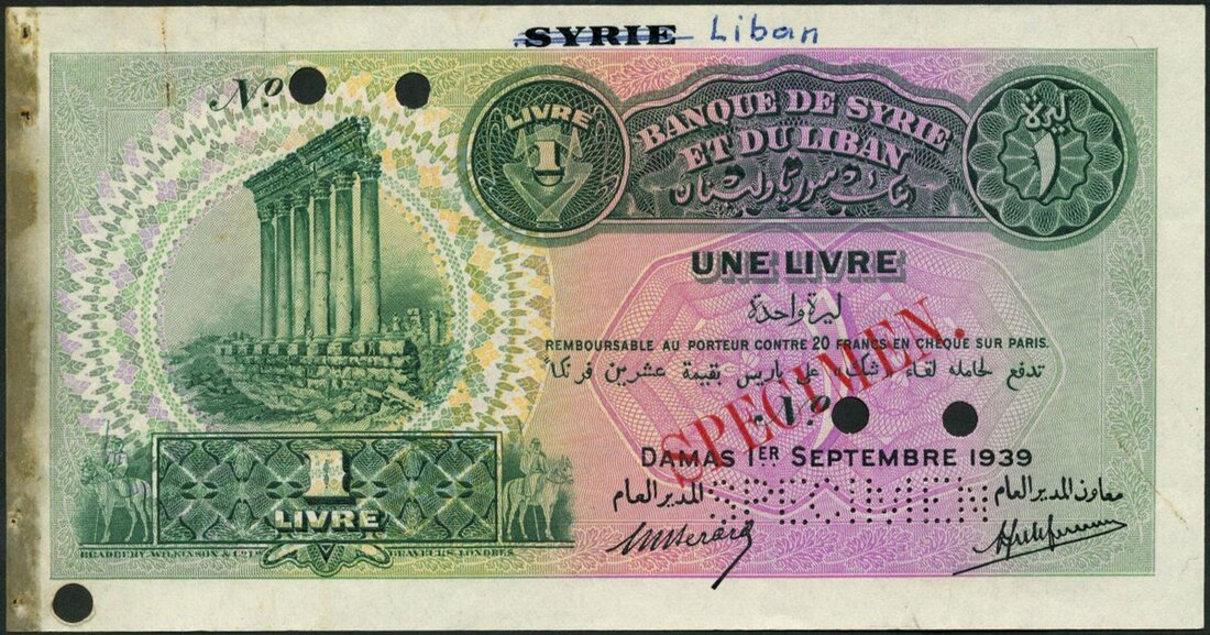 Banque de Syrie et du Liban, Syria, specimen 1 livre, 1 September 1939, no serial numbers, green and purple on multicoloured underprint, Pillars of Baalbek at left, SYRIE in black overprint top centre, Berard and Laferriere signatures, reverse red, olive and orange, vignette of city of Beirut and harbour
