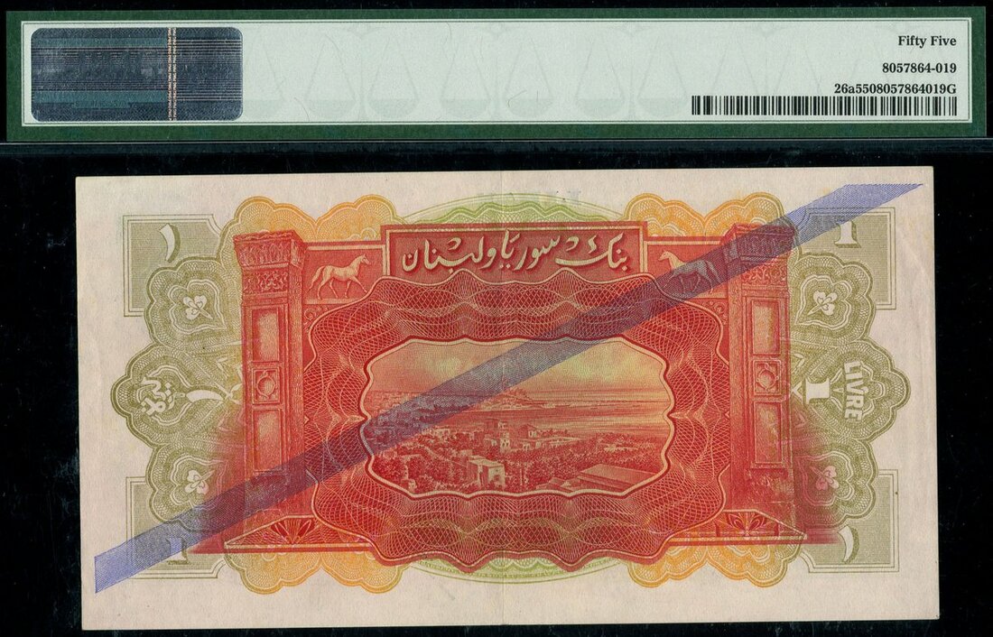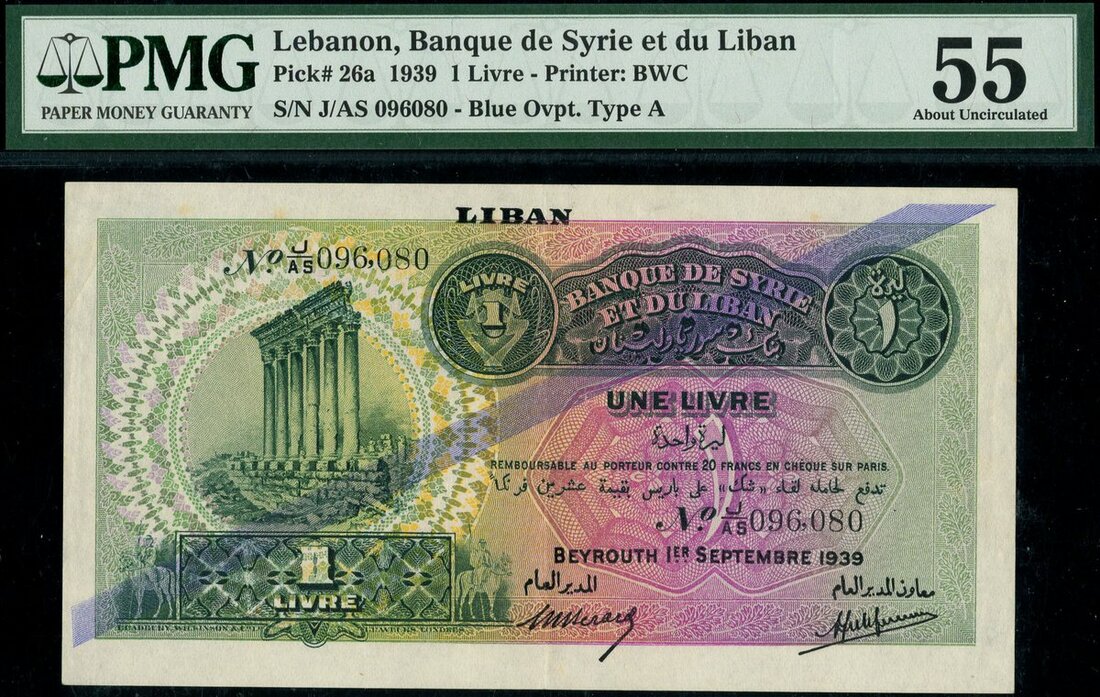 (x) Banque de Syrie et du Liban, Lebanon, 1 livre, 1 September 1939, serial number J/AS 096080, green on pink underprint, bank title top centre right flanked by value in ornate tablets, columns of Baalbek at left, blue diagonal line across face, LIBAN in top margin, reverse, olive green, red and orange, city view at centre