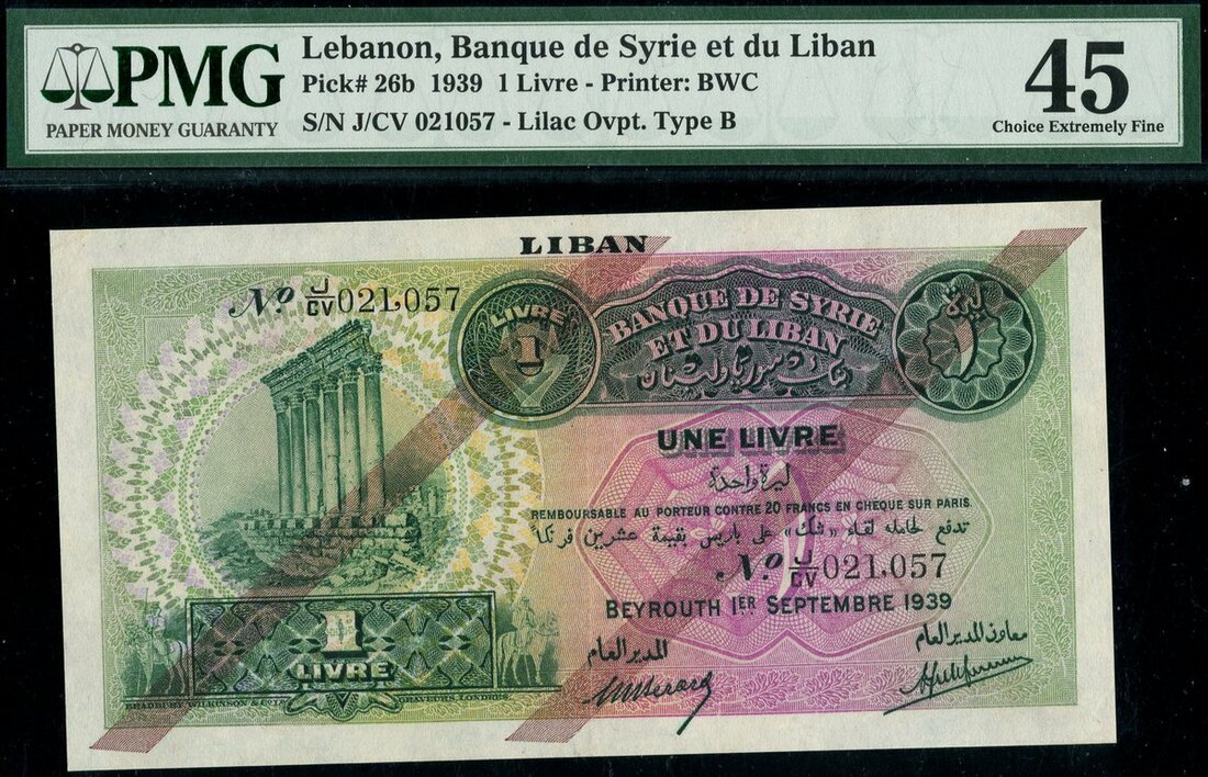 (x) Banque de Syrie et du Liban, Lebanon, 1 livre, 1 September 1939, serial number J/CV 021057, green on pink underprint, bank title top centre right flanked by value in ornate tablets, columns of Baalbek at left, two diagonal purple stripes across face of note, LIBAN in top margin, reverse, olive green, red and orange, city view at centre