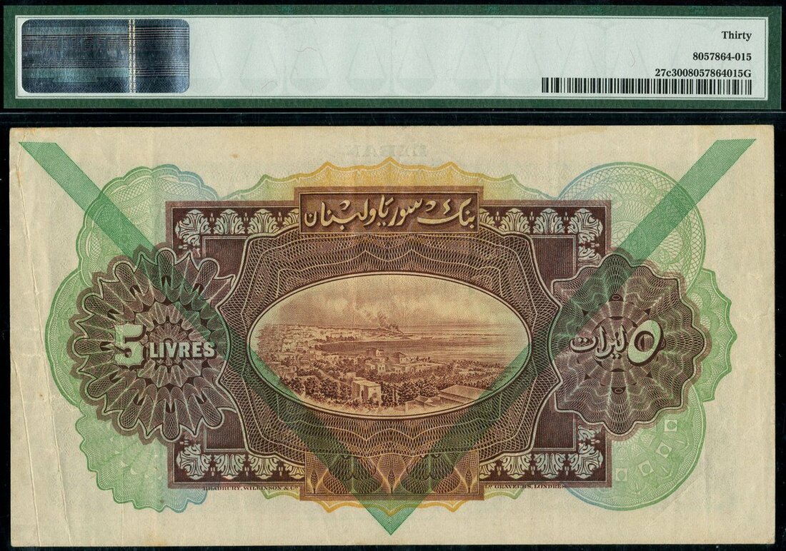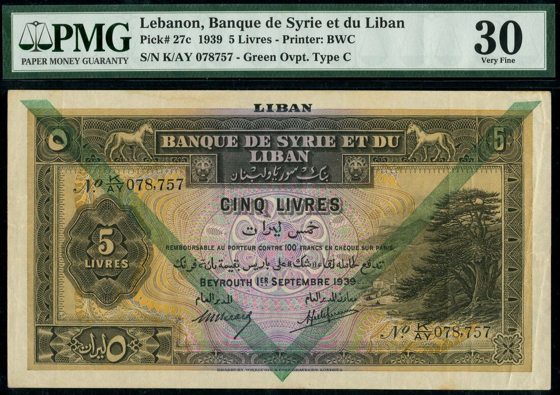 (x) Banque de Syrie et du Liban, Lebanon, 5 livres, 1 September 1939, serial number K/AY 078757, brown on multicolour underprint, Cedar of Lebanon at right, value at left, horses at top left and right, green chevron overprint, Berard and Laferriere signatures, LIBAN in margin top centre, reverse brown and green, brown and green, the Port of Beirut at centre