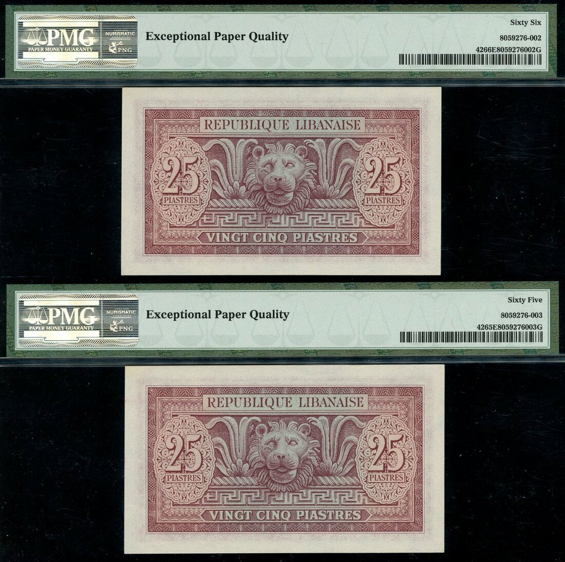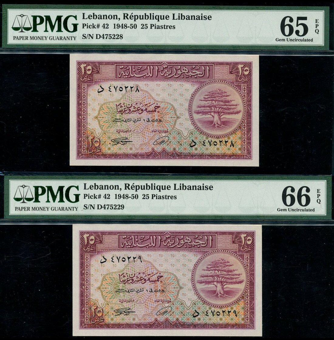(x) Republique Libanaise, Lebanon, consecutive 25 piastres (2), 1950, serial numbers D 475228/475229, purple and pale green and pink and orange, a cedar of Lebanon at right, reverse purple, lion mask at centre