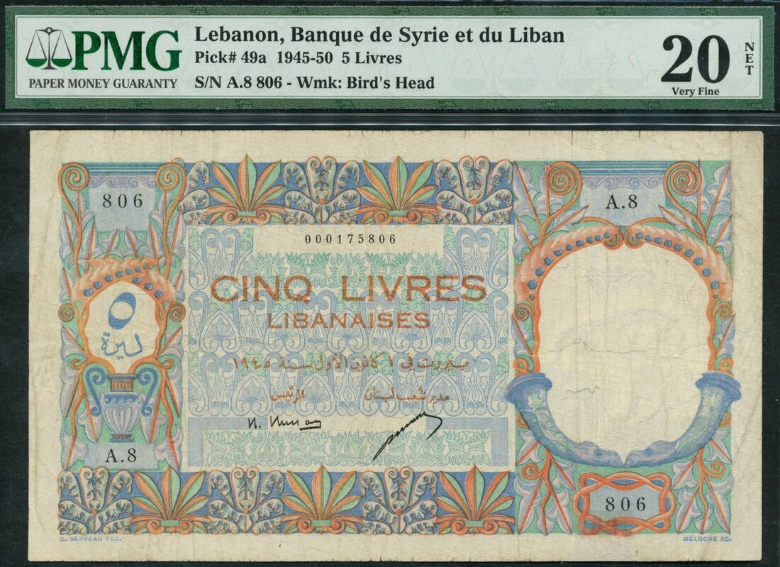 (x) Banque de Syrie et du Liban, Lebanon, 5 livres, 1945, serial number A.8 806, blue and red-brown, conjoined drinking horns at right, urn at left, ornate scroll work around, value at left, Busson and Letayf signatures, reverse pale blue and multicoloured, a view of Ras Beirut, value low centre and at each corner