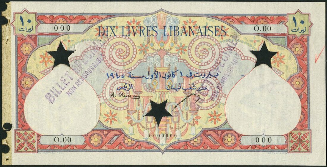 Banque de Syrie et du Liban, Lebanon, specimen 10 livres, 1950, zero serial number, red and multicoloured, geometrical patterns in field, chandelier at centre (from the El Adm Palace in Damascus), value top left and right, Busson and Letayf signatures, reverse red and multicoloured, the courtyard of the Beiteddin Palace at centre, value top left and right