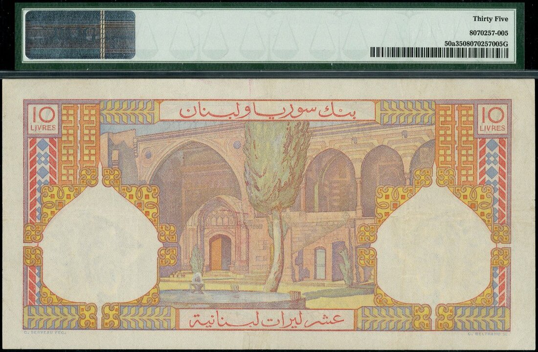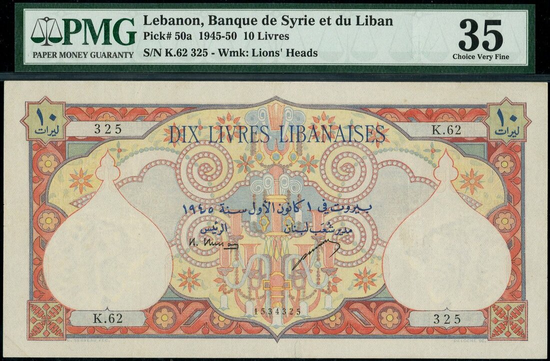 (x) Banque de Syrie et du Liban, Lebanon, 10 livres, 1945, serial number K.62-325, red and multicoloured, chandelier and ornate background detail, The president Busson and The Manager of Lebanon's branches Letayf signaturess, reverse red and multicoloured, courtyard at right