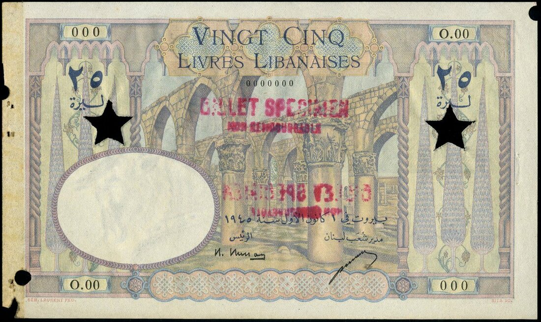 Banque de Syrie et du Liban, Lebanon, specimen 25 livres, 1945, zero serial numbers, pink-brown and multicoloured, ruins of an Umayyad Mosque at centre, value in blue top left and right, Busson and Letayf signatures, reverse green and multicoloured, a lion's head from a frieze at Baalbeck at centre, value in pink top left and right