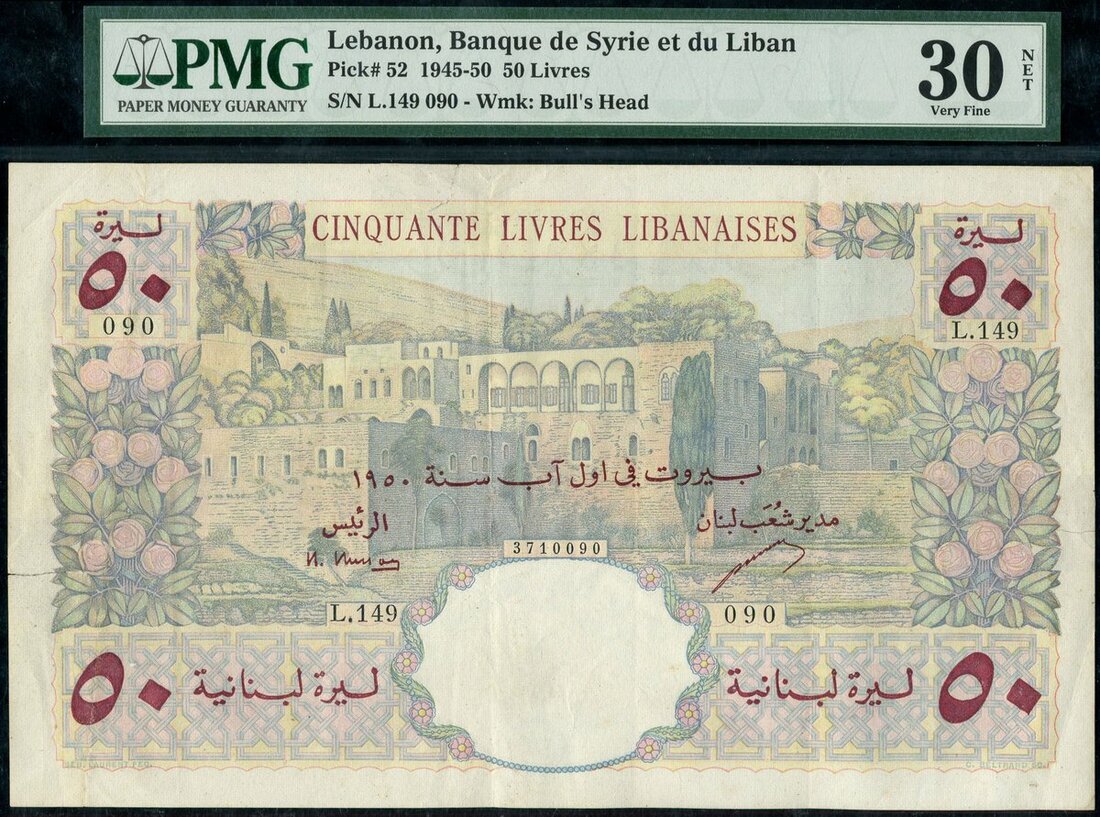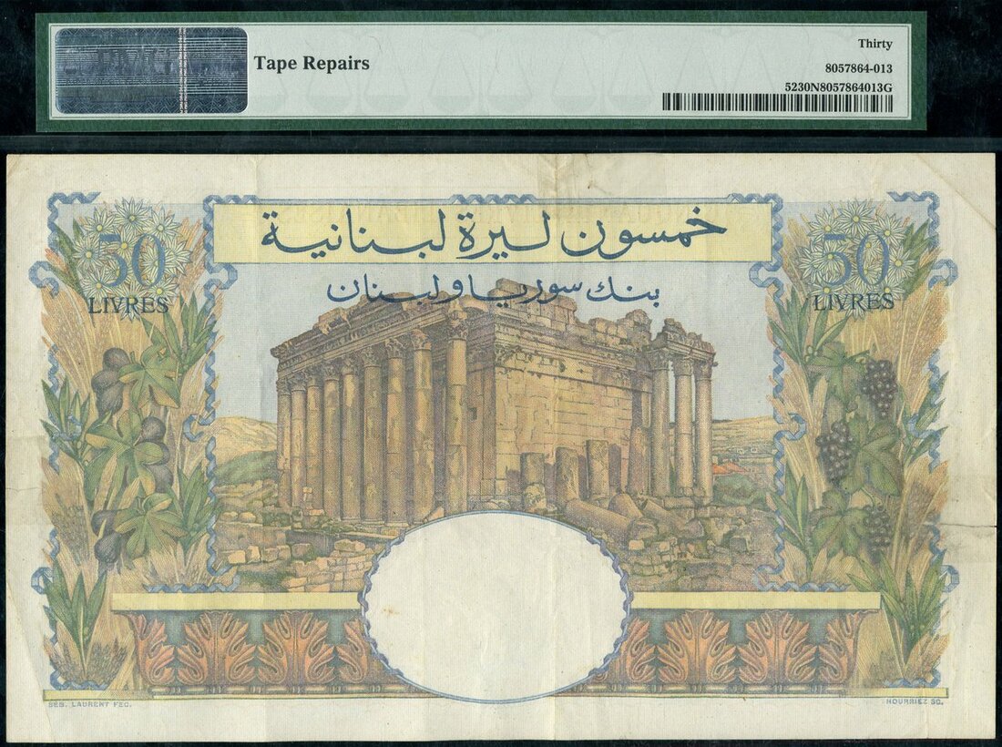 (x) Banque de Syrie et du Liban, Lebanon, 50 livres, 1945-50, serial number L.149 090, multicolour, Beiteddin castle, reverse, Roman Templr of Bacchus at centre,