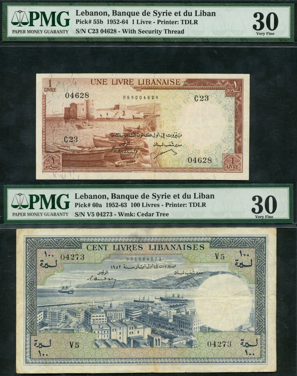 (x) Banque de Syrie et du Liban, Lebanon, 1 livre, 1961, serial number C23 04628, also 100 livres, 1952, serial number V5 04273,
