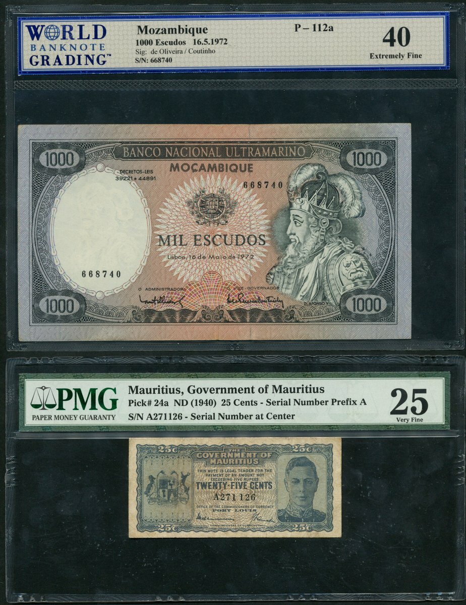 A mixed group comprising Mozambique 1000 escudos, 1972, Mauritius, 25 cents, ND (1940), El Banco de Espana, Bilbao 1000 pesetas, 1937
