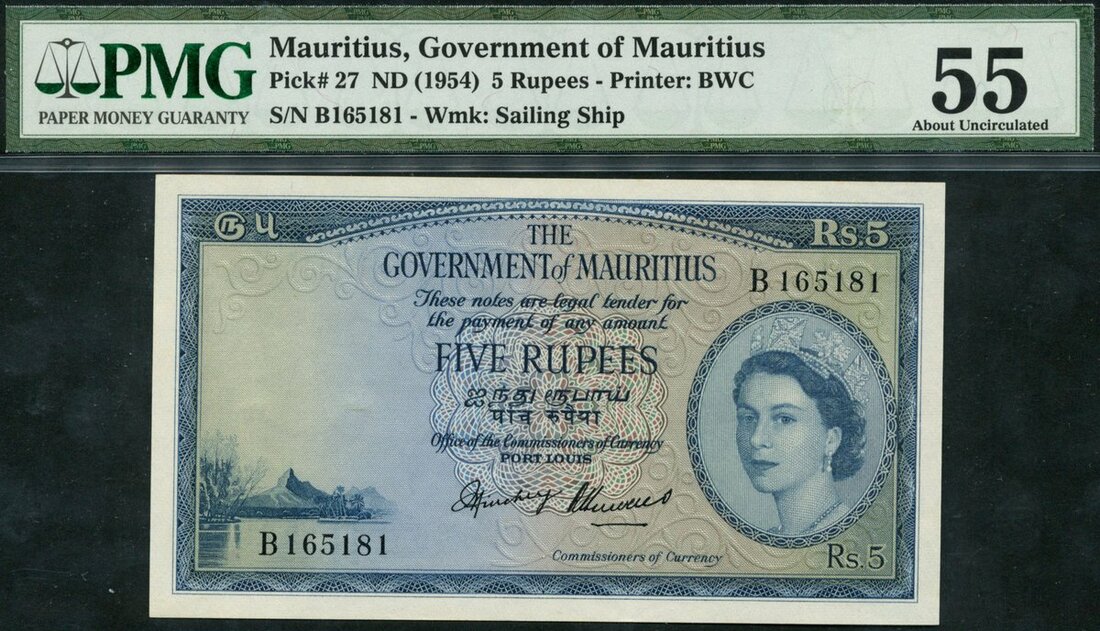 (x) Government of Mauritius, 5 rupees, ND (1954), serial number B165181, (Pick 27), in PMG holder 55 About Uncirculated