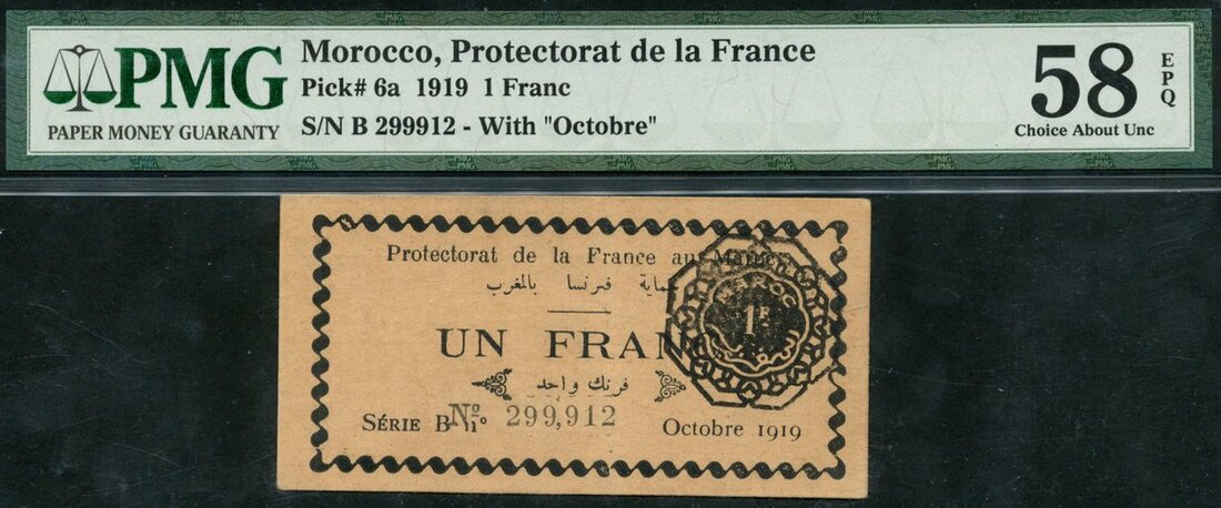 (x) Protectorat de la France, Morocco, 1 franc, 1919, serial number B 299,912, (Pick 6a, TBB B104a1), in PMG holder 58 EPQ Choice About Unc