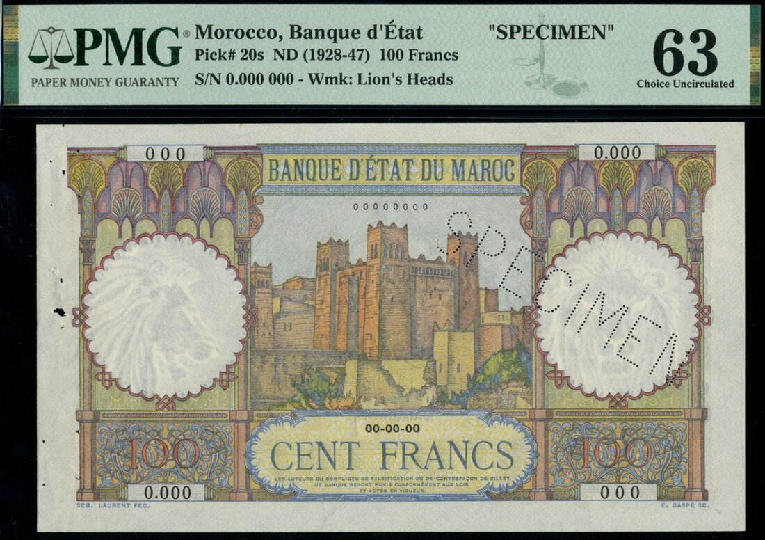 Banque d'etat du Maroc, specimen 100 francs, ND (1945-47), serial number O.000, multicolour, French text, Kasbah (fortress) of Ait-Ben-Haddou (a living example of outstanding traditional architecture of the Moroccan culture in the south) at centre, denomination at lower left and right, signature Guessous, Spitzer and Oudot, reverse Arabic text, arabesque pattern