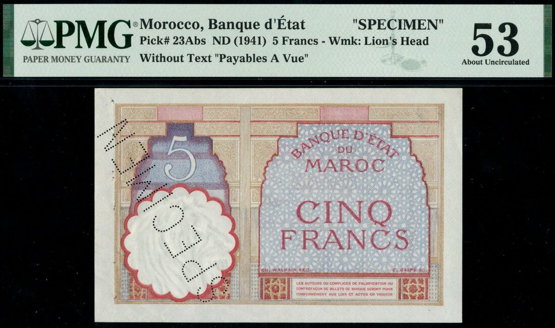 Banque d'etat du Maroc, specimen 5 francs, ND (1941), brown, red, and blue, French text, arabesque pattern, denomination at upper left, reverse, Arabic text, arabesque pattern, watermark, lion's head