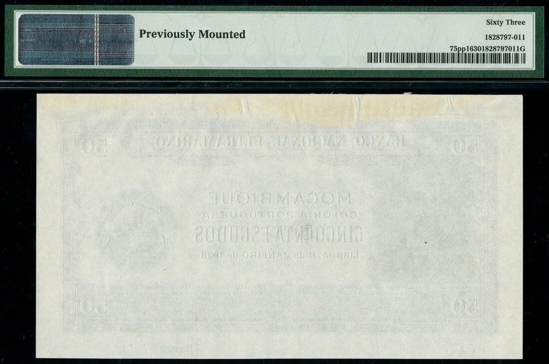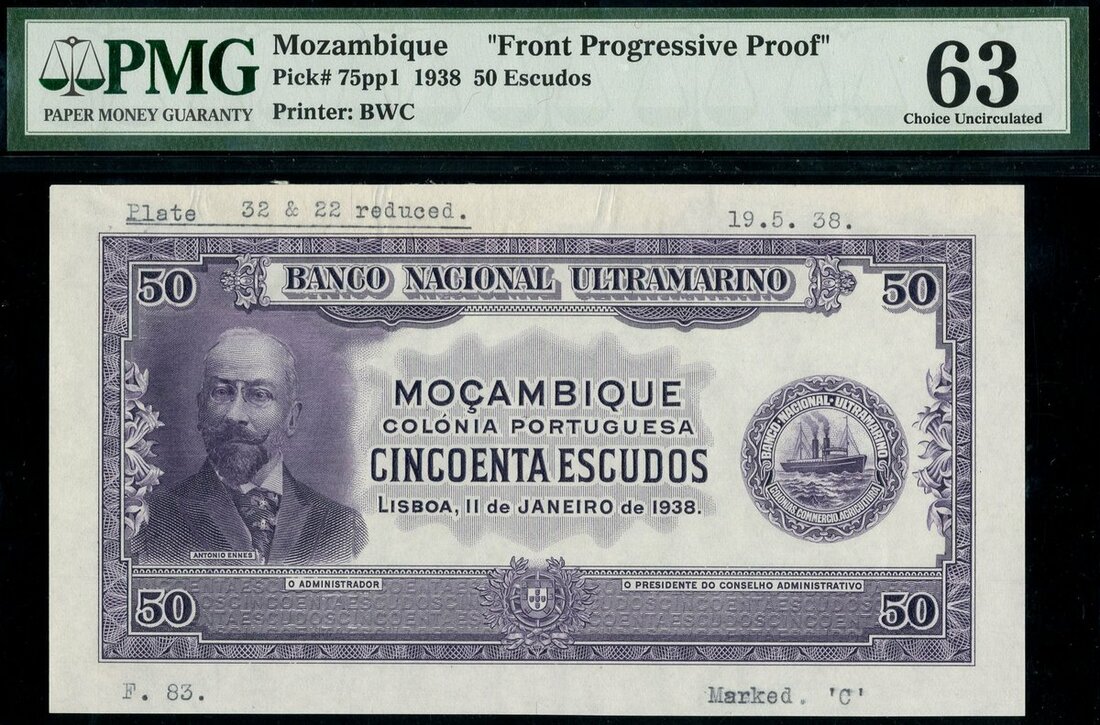 Banco Nacional Ultramarino, Mozambique, an obverse progressive proof for a 50 escudos, 1938, violet and white, Antonio Ennes at left, ship seal at right