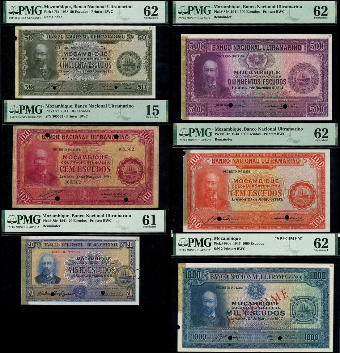 Banco Nacional Ultramarino, Mozambique, a group of notes from 1939 to 1947, including remainder 50 escudos, 1938, olive, 100 escudos, 1941, red, remainder 20 escudos, 1941, blue, remainder 500 escudos, 1941, mauve, remainder 100 escudos, 1943, orange, specimen 1000 escudos, 1947, blue, all Antonio Ennes at left, arms low centre and ship seal at right,